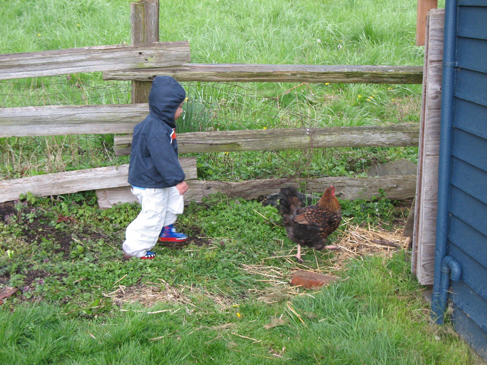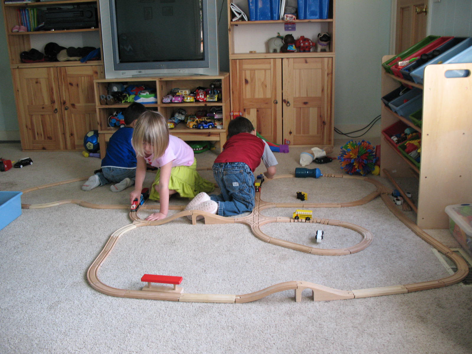 Well, it’s Spring Break and all the kids are home all day to play, yippee! We’ve had fun day #1. We played with trains (we got some new fancy pieces so we could make much better tracks). We also fed the neighbors chickens and tried to chase them around the yard but the boys wouldn’t let them get far enough out of the cage and kept running them back into their pen. We did 3-D easter egg cutouts most of the morning yesterday and even ran around outside some after nap, too. Carlos got to go to “noodles and meat” with Nana and Papa, his favorite.