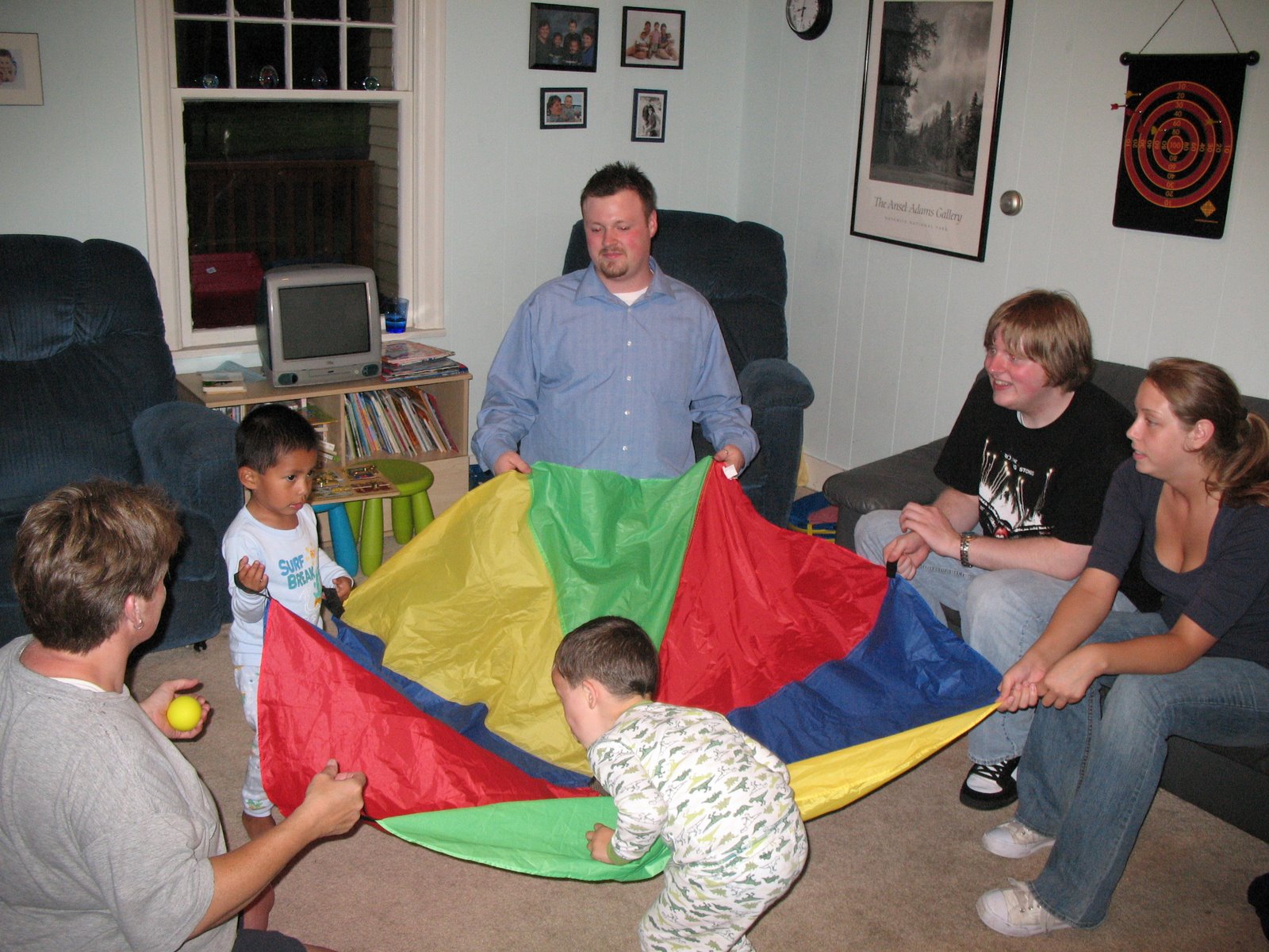 We came home and got to have dinner with my cousins, Nathan and Andrew and Andrew’s girlfriend, Mindy and Nana and Papa. Andrew and Mindy live in Montana so we don’t get to see them all that often and the boys were showing off in a gigantic way. We got out the parachute and I don’t know if the boys had more fun or the grownups. You’ll see by the video. The other video is the boys running in circles, this will prove just how amped up they were. Nathan’s watching in the background…is this how he babysits? 🙂
