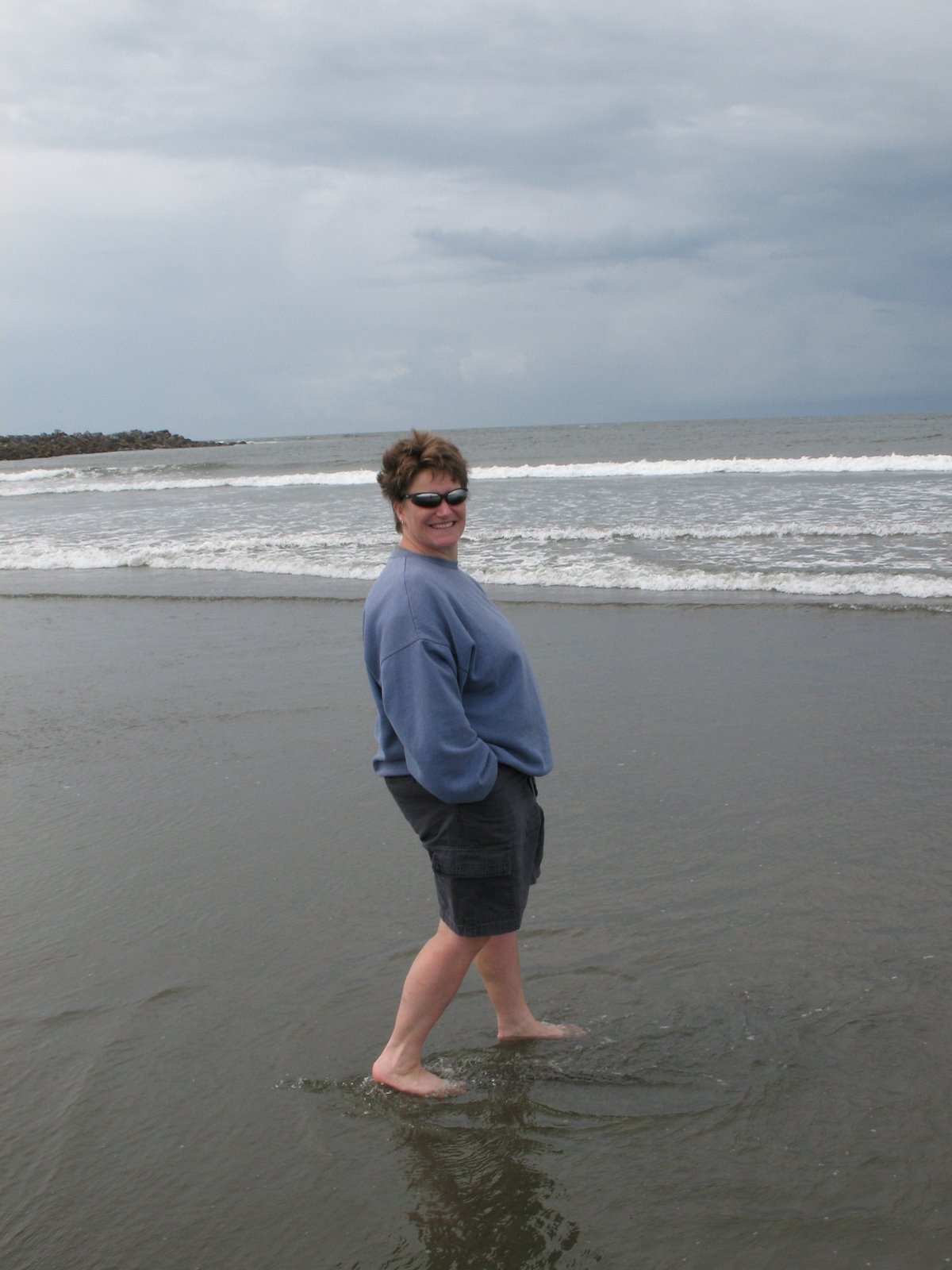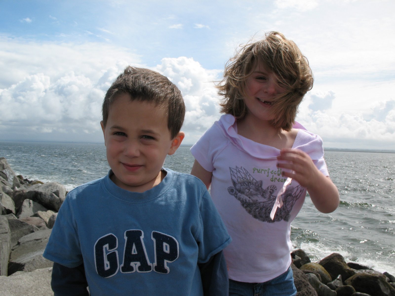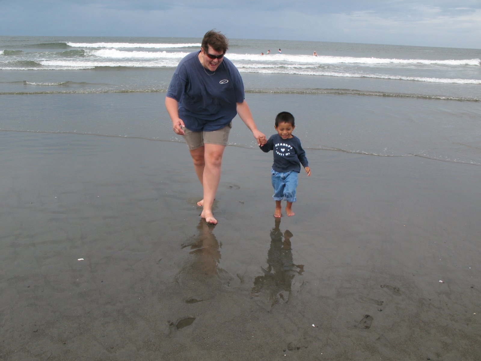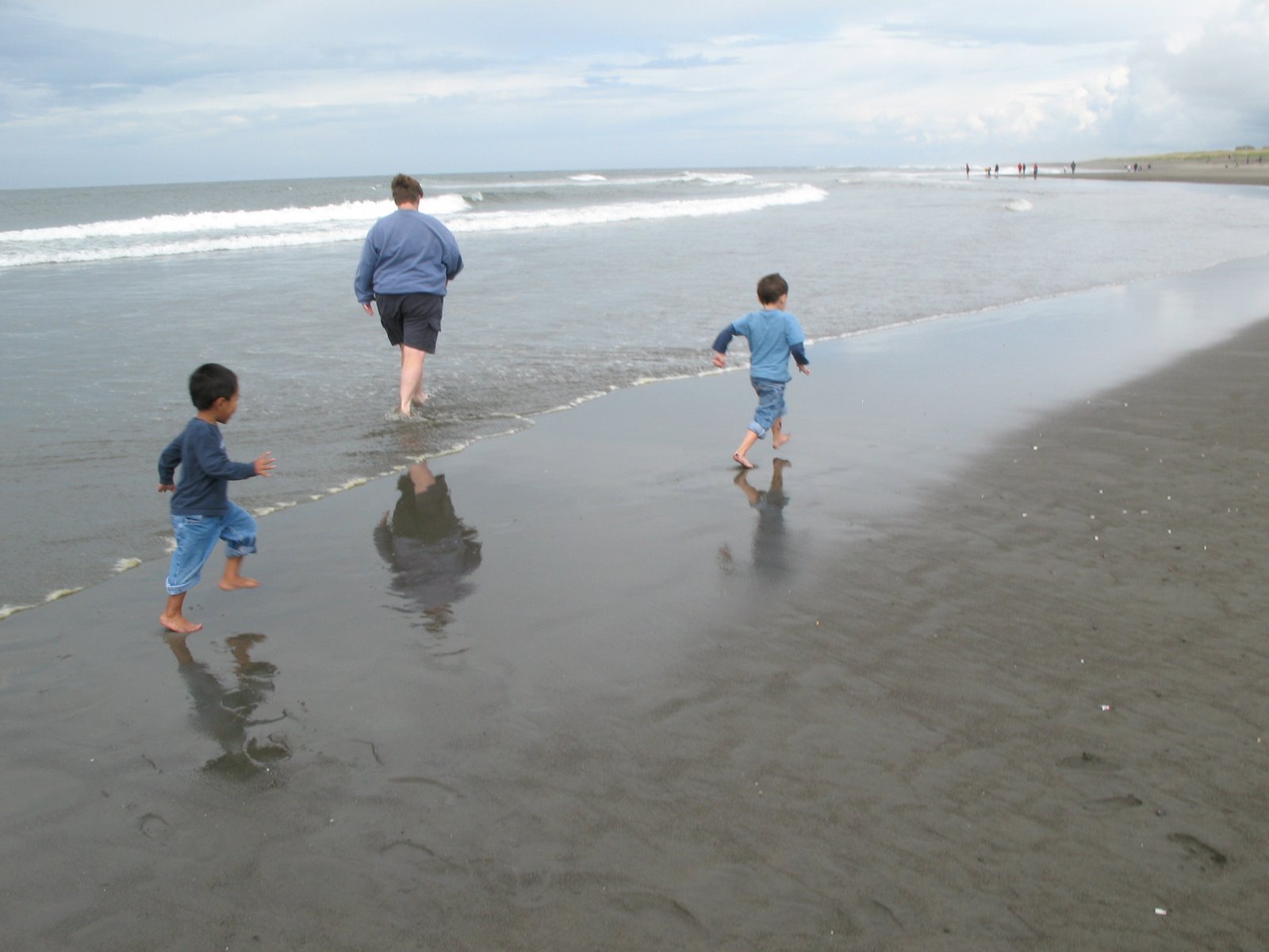 Then we took off to the Jetty where we walked around on the rocks, Scott brought up a couple of starfish and the boys got to touch them. We walked down past the Jetty to the beach/ocean and the boys couldn’t wait to get in. They kept walking out almost to the water, then when it would come back in they would screech and run back in. Eventually they just stood there and got wet. They loved it.