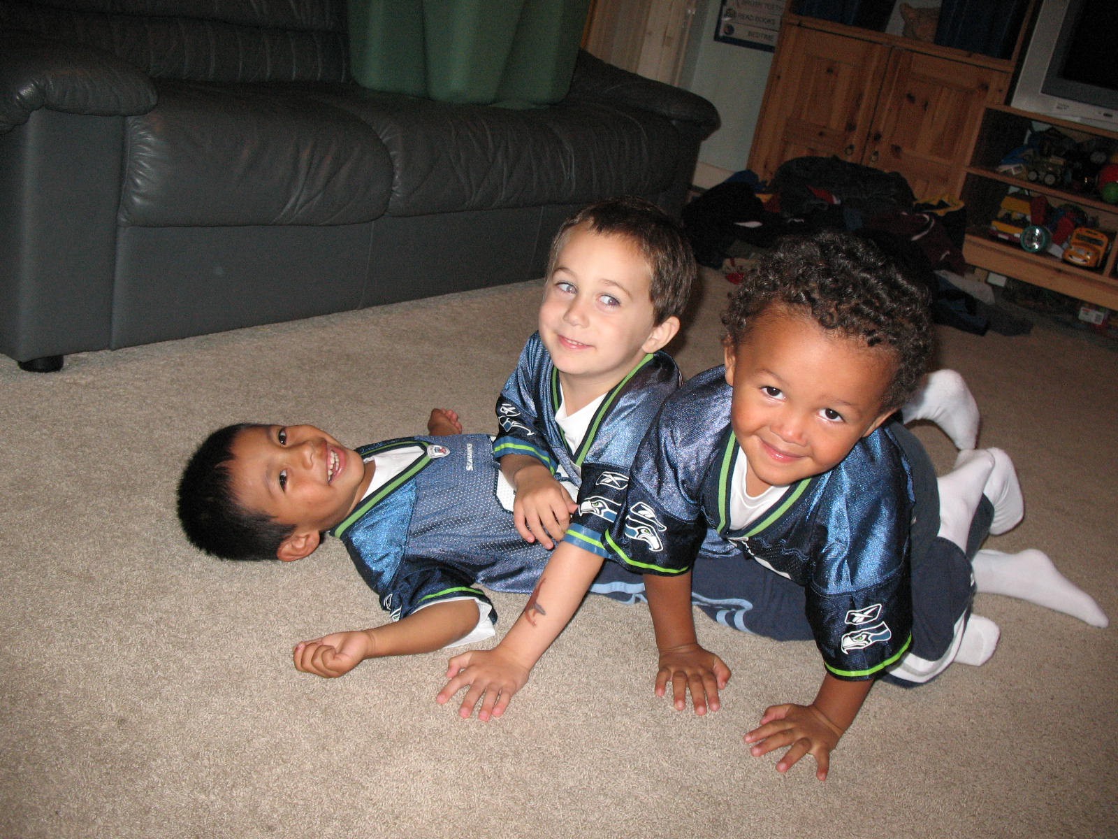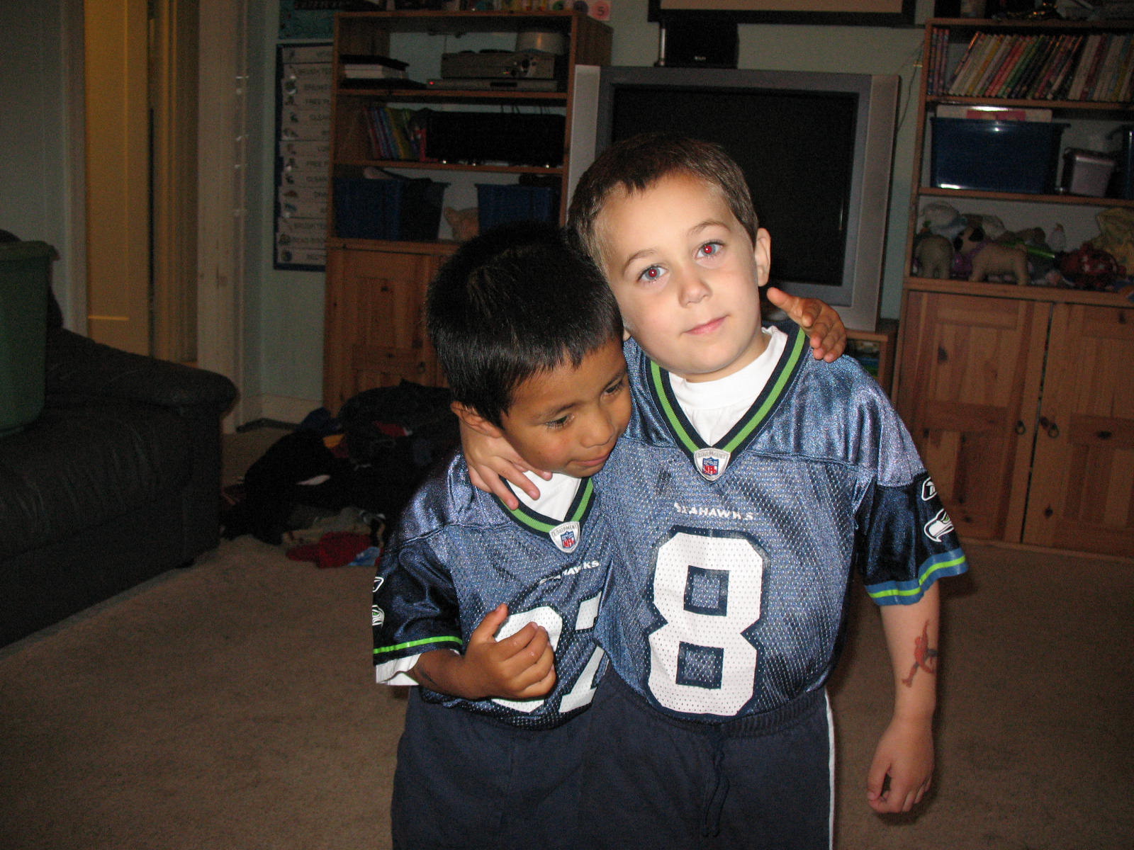 Football Sunday is a tradition at our house…the boys get their jerseys on and watch the Seahawks game. They love it! The picture of Levi and Carlos was so sweet, they had their arms around eachother and were showing the love, THEN it turned into a wrestling match. That’s usually how it happens around here.