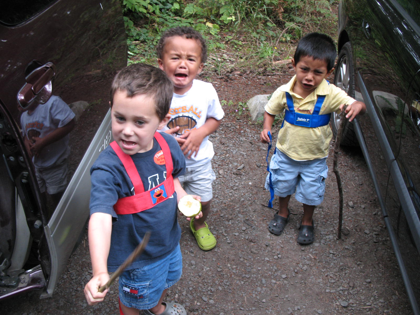If you’ve kept up with the blog you will remember our last trip to the Grand Forest. It wasn’t good. We told Levi and Carlos that the next time they had to earn back our trust and so they were on leashes for the first half of the walk. They weren’t too happy about it. Carlos suggested that he hold his own leash, HA! You’ll see in the first picture that Trey was crying…he wanted a leash, too. He didn’t realize that he was being rewarded for not running away, he just wanted to be like his big brothers.