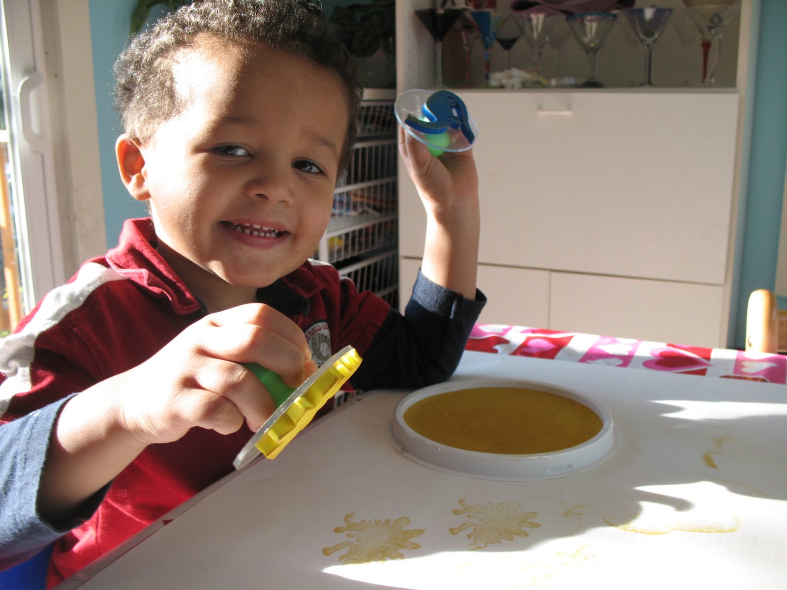 The phone rang at 5:30 this morning. Who calls at 5:30 in the a.m.? I could help but startle awake and assume something bad had happened. Turns out, it was the school’s automated system telling us that there was no school today due to snow. I got up, rubbed my eyes and slowly lifted the shades to see all the snow. Um, what snow? We had a dusting of frost but there was NO reason school should have been cancelled. Someone’s going to be in trouble for this one. It’s clear and dry, not even a flake on the ground at this point. So, I’ve got the boys busy with craft projects so they aren’t thinking about missing school and they are little Picasso’s with stamp pads.
