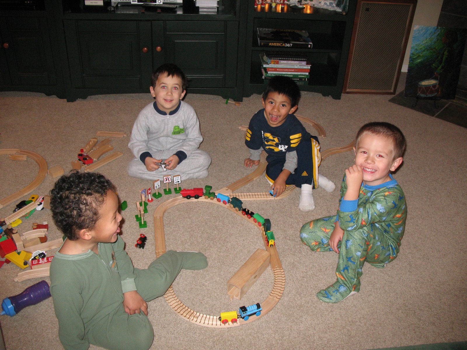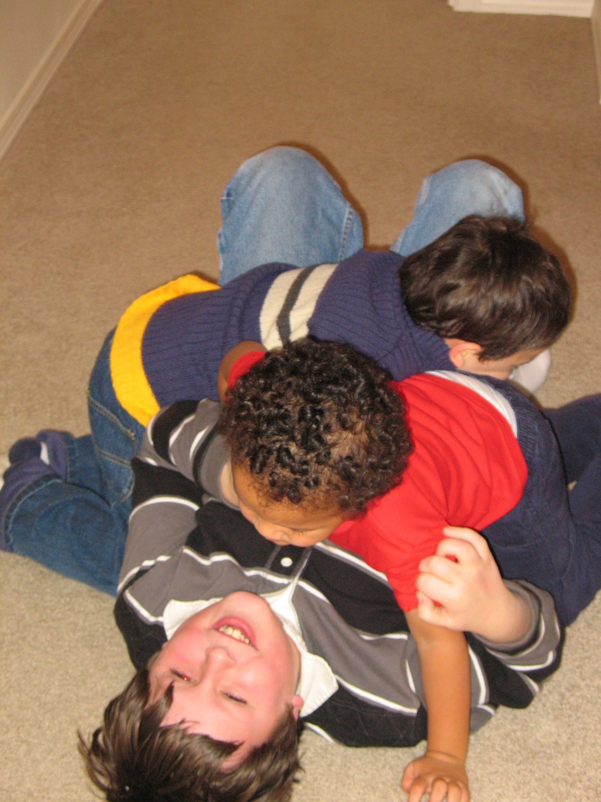 We went to the boy’s friend A.J,’s birthday party this afternoon. Levi, Carlos and Luca all LOVE trains and that was the theme. A.J.’s family did a great job, they rented a big space, set up some ride on trains and a train table. The kids went wild. What a great way to spend the afternoon for them.