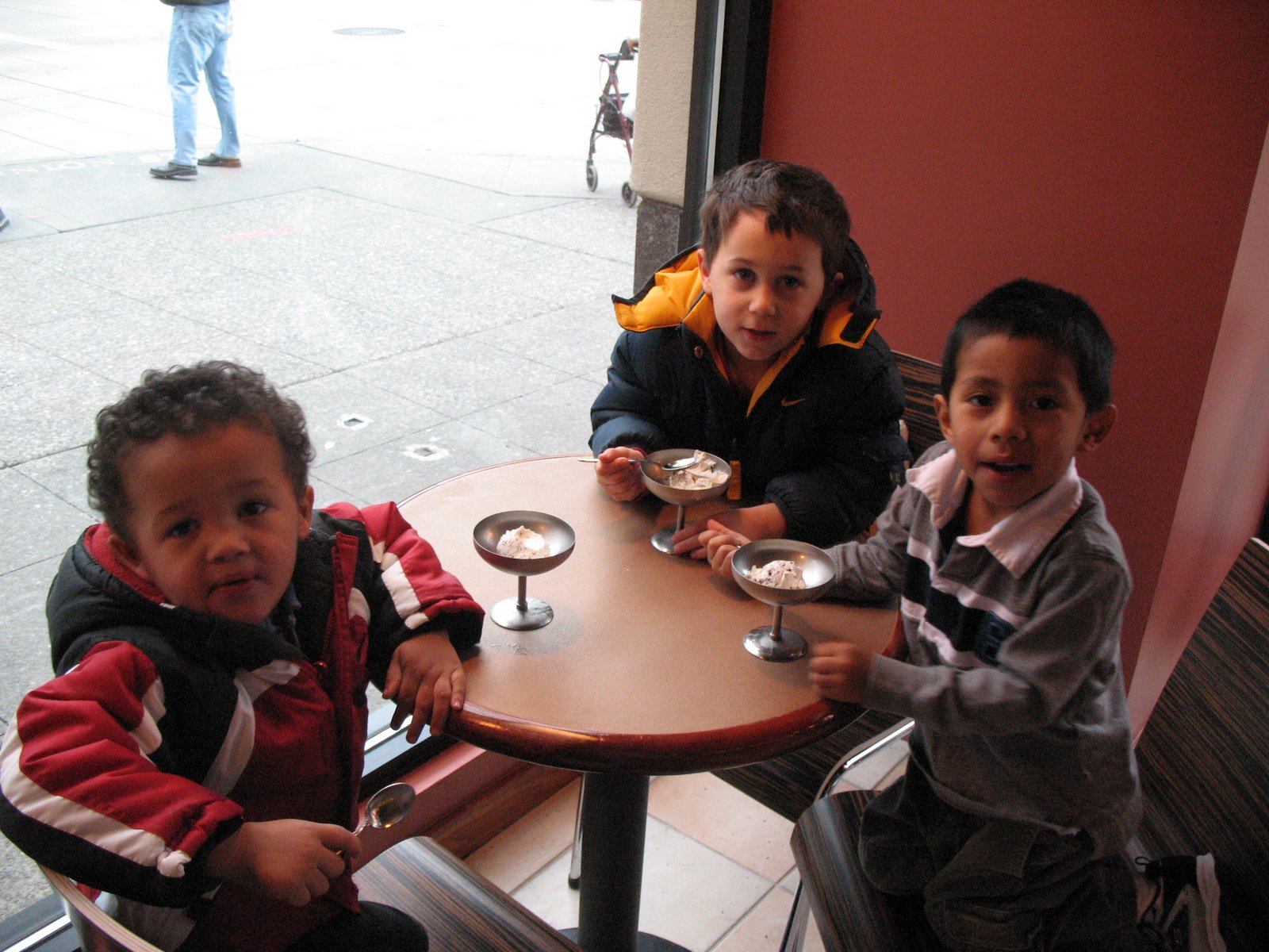 Friday morning, my mom and I took the boys to Seattle to the Tiny Tots Symphony. It’s pretty cool, actually, they have a few of the instruments featured and it all geared down to a kids level. Levi took a minute before it started to give Papa a call, Trey and Nana cheesed for the camera and Carlos stole my hat but looked so darn cute in it I couldn’t fight him. Trey gets so into the symphony, claps along and really enjoys the music, but late mornings are tough for Trey, as it’s naptime and he just couldn’t stay awake for the whole performance. As a treat after the symphony, we always go across the street to get gelato. Cute pic of the guys enjoying their treat!