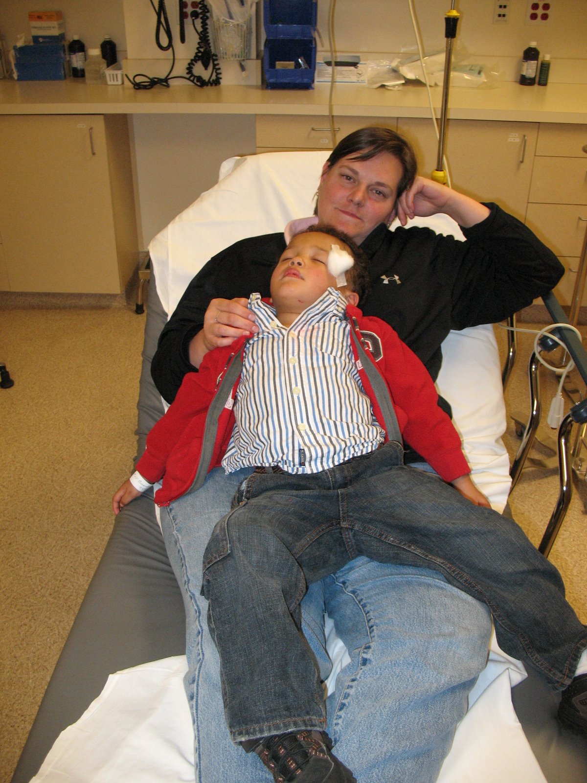 The packaging didn’t quite look like this, but you get the idea. Trey crashed into a table at Saturday Club today and cut his head. It wasn’t horrible, but enough where we needed to take him into the ER. So, our day looked a little like this…