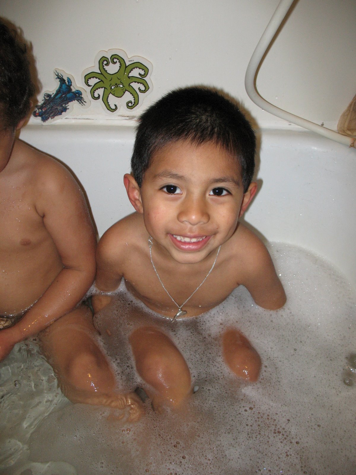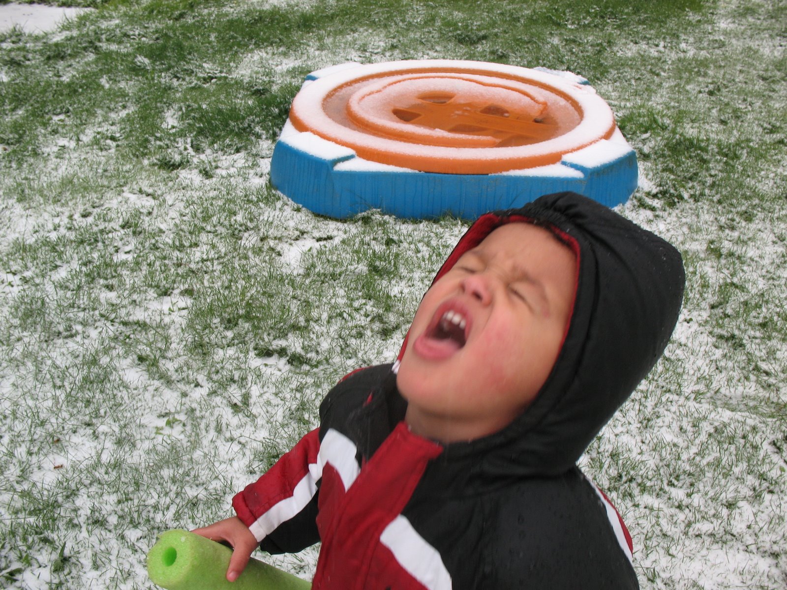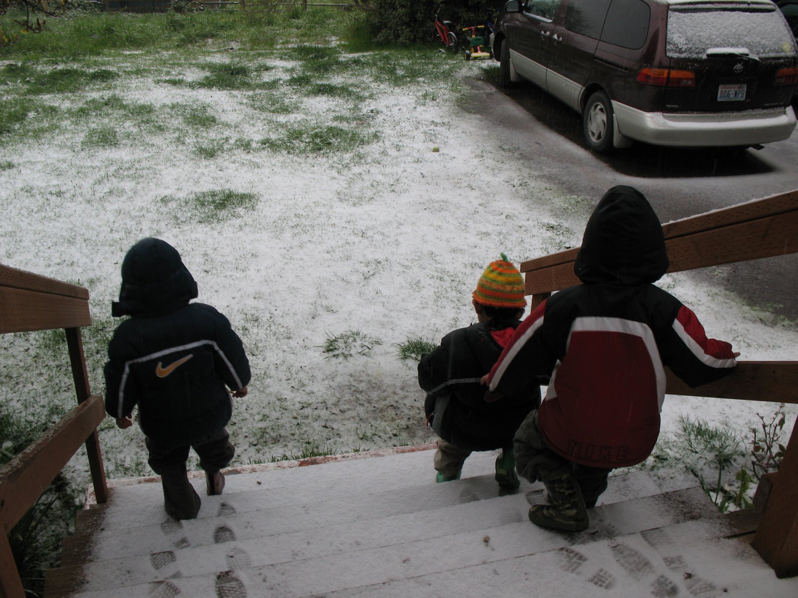 Started the day out lazy, Dee finished up her book and Trey played with Baby X. I ran to the store with Carlos and Levi slept in. When Carlos and I got home it started to hail, a LOT and for about 10 minutes. Then it turned to snow, for almost an hour. It was wet, and not a ton of it but the boys had fun playing outside and catching it on their tongues. Came in and warmed up in a steaming bath. Like Carlos’ new necklace? Twenty five cents at Safeway and he won’t take it off.