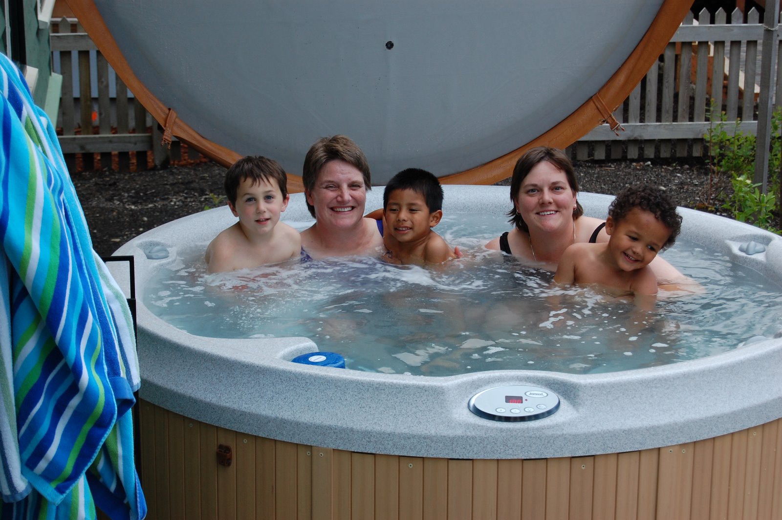 The weather isn’t ideal, it’s rainy and windy, but we’ve made the most of it and have been out enjoying the times when the rain lets up. We went bike riding again, took a dip in the hot tub and Nana and Papa made a tasty steak dinner (the picture of Carlos is him eating his favorite…salad!).