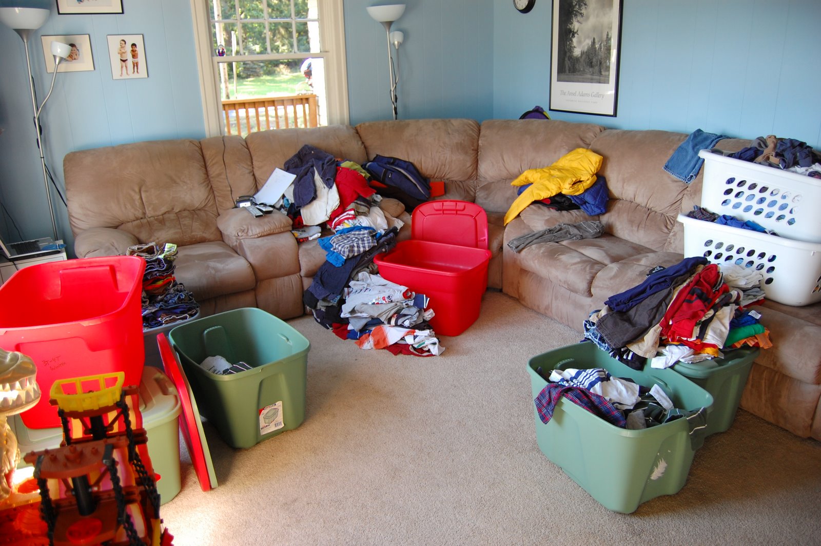 We tried…and we’re about 1/2 way through the dreaded trying on of fall clothes. The fun of living in the beautiful Pacific Northwest is that summer lasts for about 2 months and then the drizzle and gray skies settle in. I’m still hoping for a few more days of sun but we’ll see. We were hoping to finish trying on clothes and all today but we had total meltdown and decided naps were much more important. So we’ve got