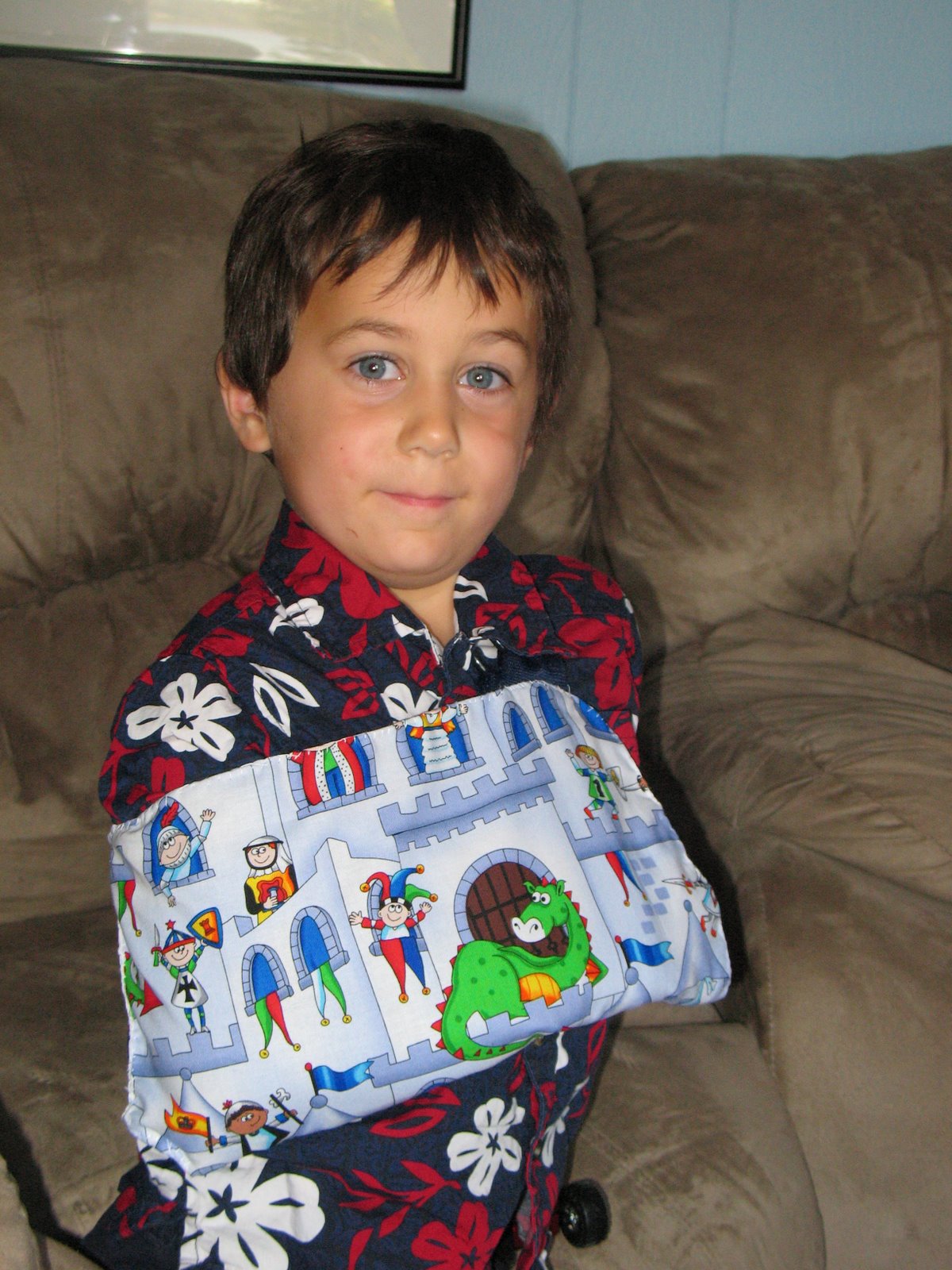 I bet you’re amazed….yeah, buttons are just about the extent of my sewing capabilities but here’s my latest attempt at being a seamstress. Levi picked out this cool castle theme fabric to cover his sling, it’s much cooler than the navy blue one. I did it by hand, it’s not perfect, but he likes it and that’s what counts!
