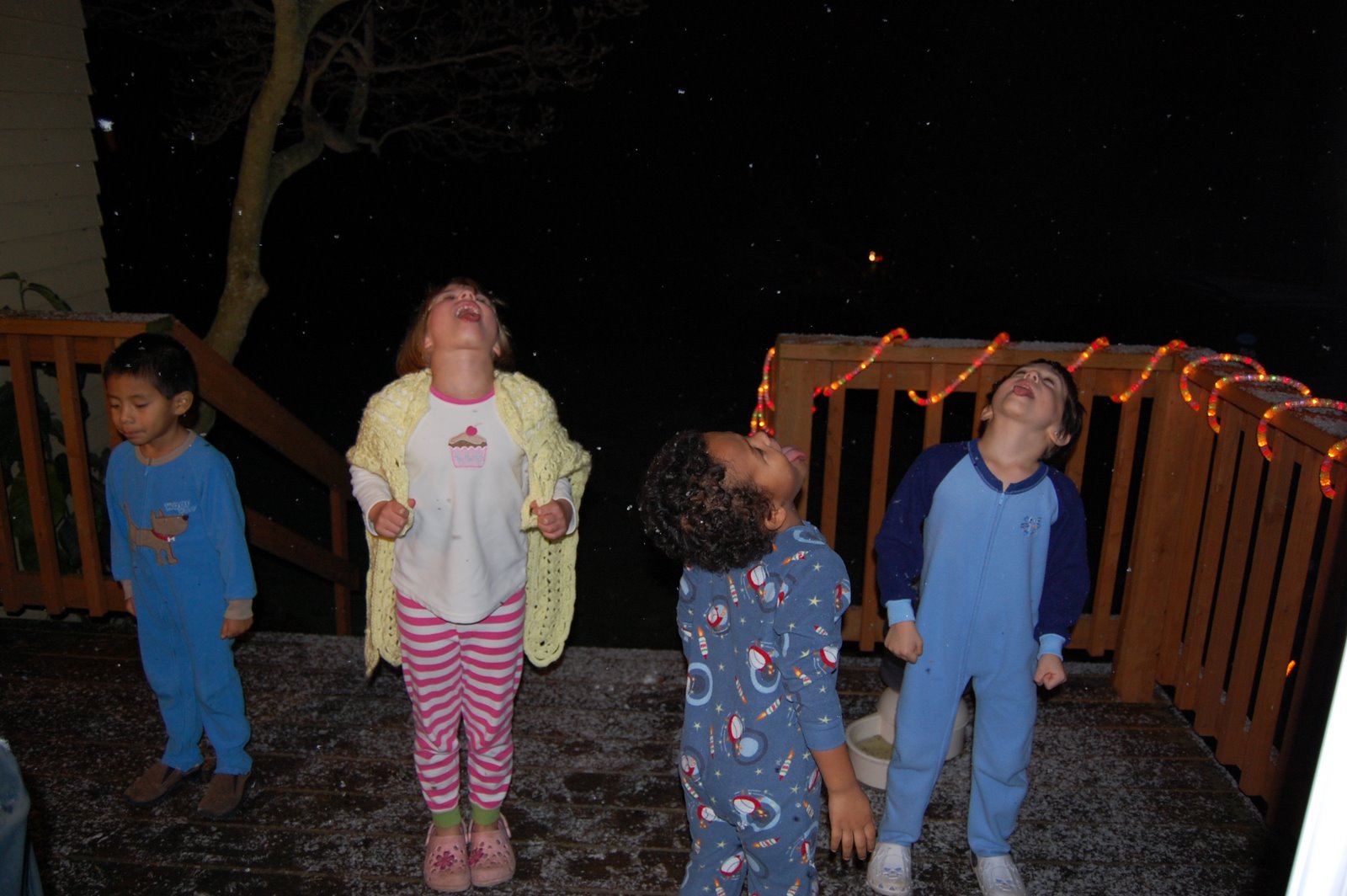 It’s just a dusting….but it’s what we’ve got so far and it’s still falling! The kids were excited to go out on the porch and try to catch snowflakes and Levi even made a pea sized snowball to throw. They didn’t seem to care that it was just a trace, but they’re Western Washington kids so they just don’t know that “real” snow is deep and that snowballs are really supposed to be bigger than a pea. Ignorance is bliss!