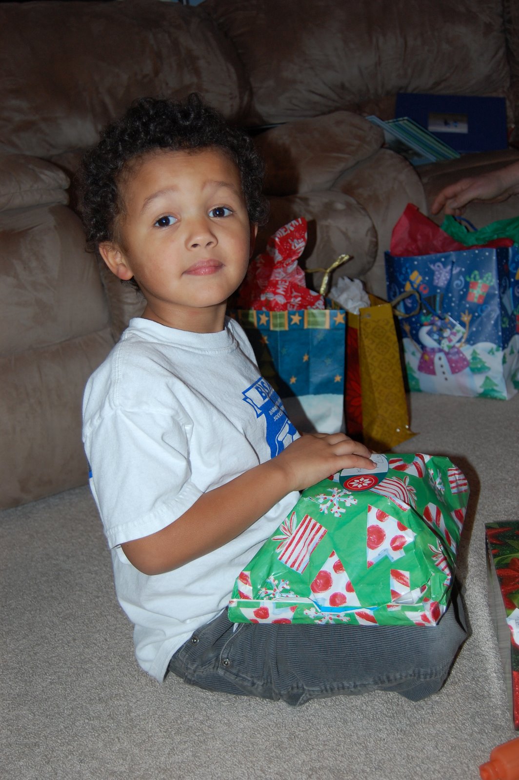 We had a nice family dinner with Maymay and Alice then did our Christmas celebration with Papa B and Sandy. They spoiled the boys…they each got a Scooby Doo movie (their favorite!), a notepad and some preschool learning books, a sweatshirt and a cool ceremic sports bank with money inside. We had one minor disappointment when Carlos opened his basketball bank and went to bounce it….shattered all over the living room and he was embarassed and crushed. We’ll be on the lookout for another one for sure.