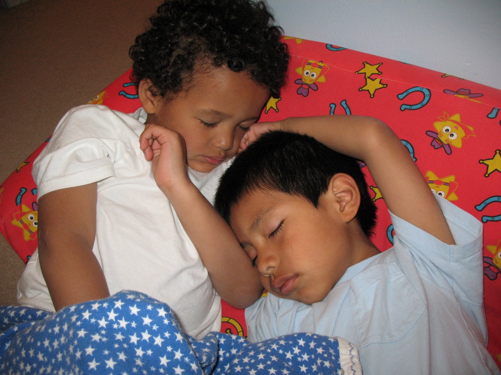 So we did the “Get Out of Bed Once” Pass. Each boy has a pass, and he can use if to get out of bed one time to take care of whatever need arises. Sometimes it’s an extra hug and kiss, sometimes a trip to the potty or a drink of water. It’s worked wonders and the boys, for the most part, only come out of their room one time. To make it work there had to be a consequence for coming out a second time. For us, it’s having to sleep upstairs in the playroom (they don’t have to sleep there all night, we’re not monsters…we bring them downstairs after they fall asleep). The other night both Trey and Carlos ended up in the playroom, and it turned out to be the sweetest moment. They weren’t goofing around, they knew it was time to sleep, so they snuggled up and fell asleep. No matter how they bicker, fight and push eachother’s buttons….deep down they truly love eachother.