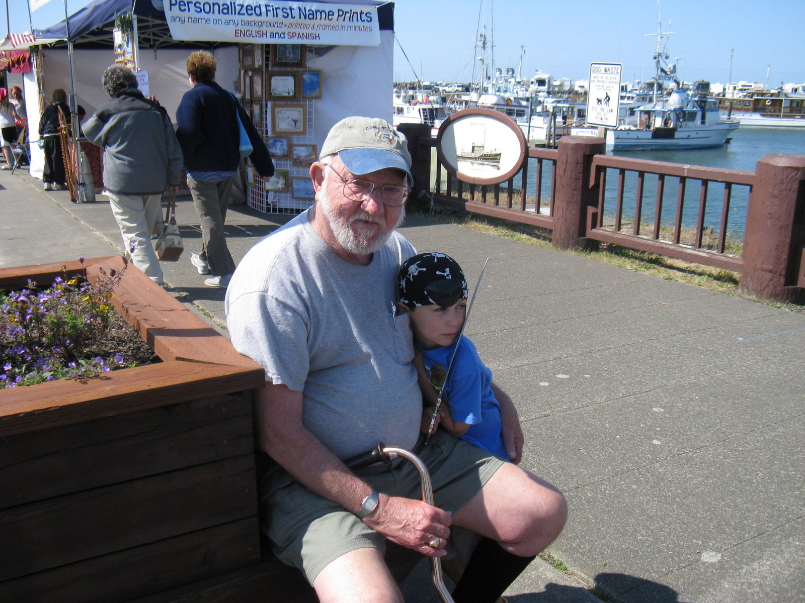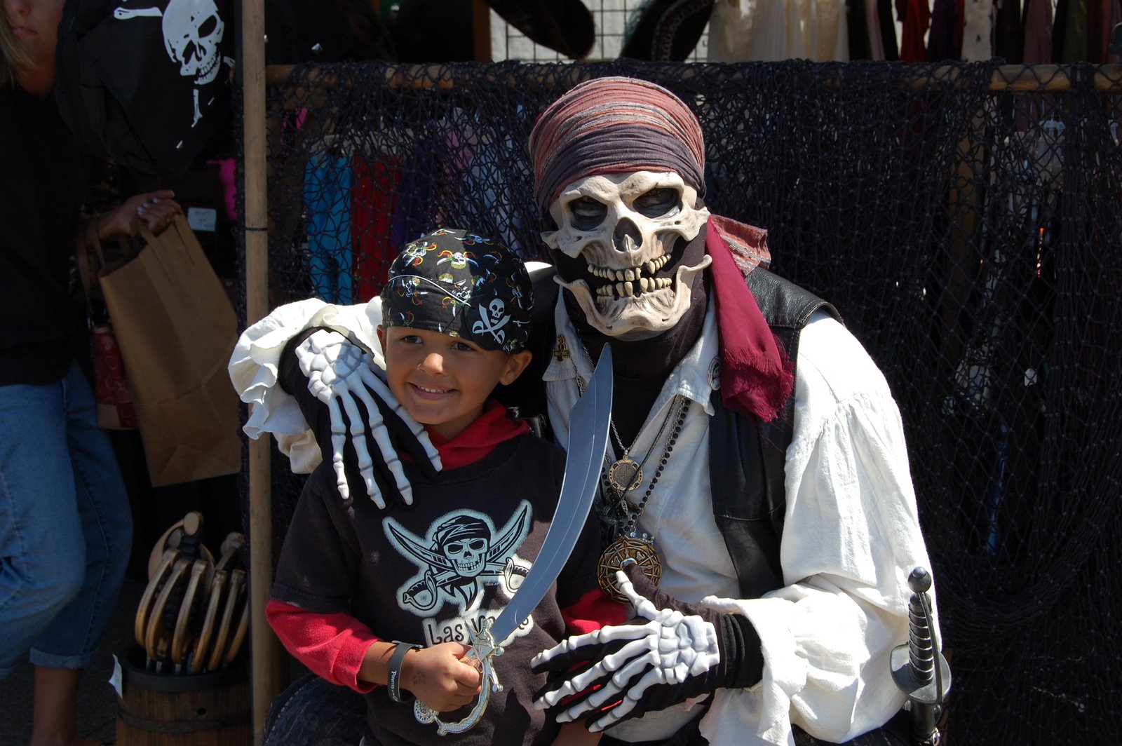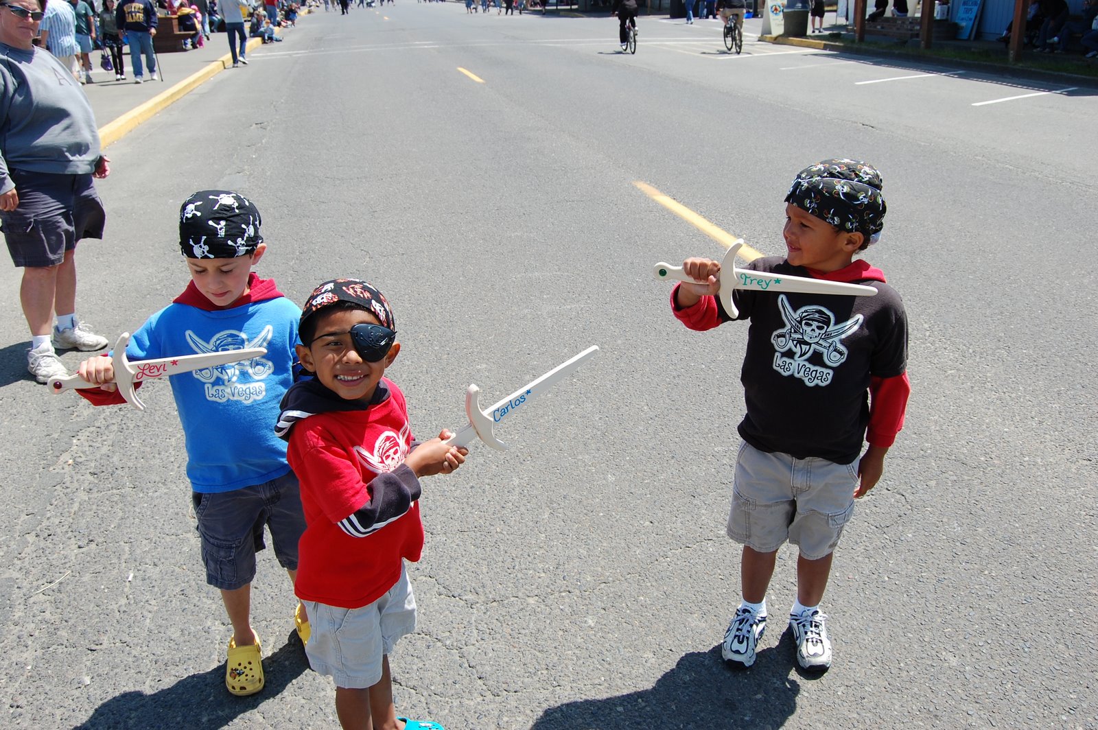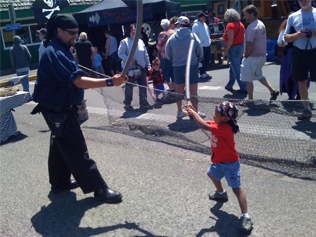 If you aren’t familiar with Westport, it’s just a tiny fishing village down by Ocean Shores but for this weekend they transform the street by the marina into vendor booths and the pirates come out of the woorwork in full garb. It’s pretty amazing and very family friendly. There are pirates who let the kids come and sword fight, ones making balloon swords, lots of food and cool pirate gear being sold and all are more than willing to talk to the kids about their antique guns, swords, etc. I have to say that there isn’t much cooler for 4, 5 and 6 year old boys than pirates and they are EVERYWHERE. Of all the boys, Trey is in 7th heaven and can’t get enough. He loves this one guy dressed up as a skeleton pirate and wants to keep going back to see him, Carlos is all about the sword fighting (he took a big pirate down!) and Levi is doing some serious people watching (he’s still recovering but being a total trooper).