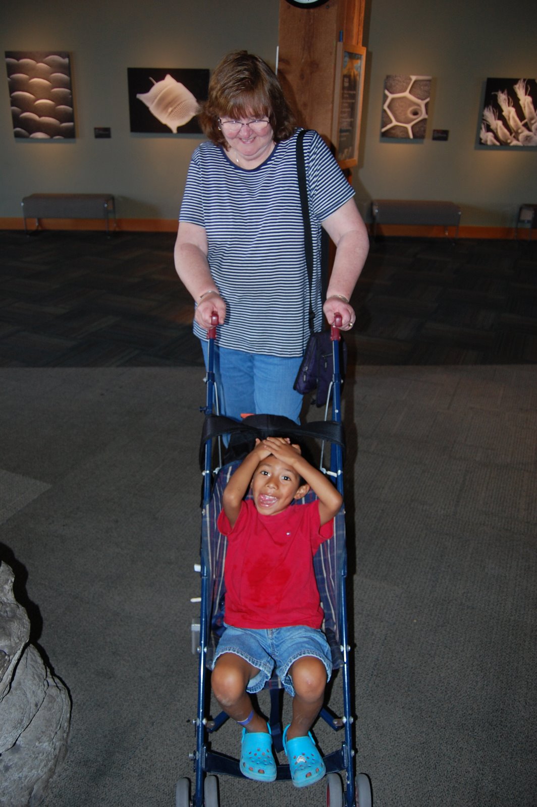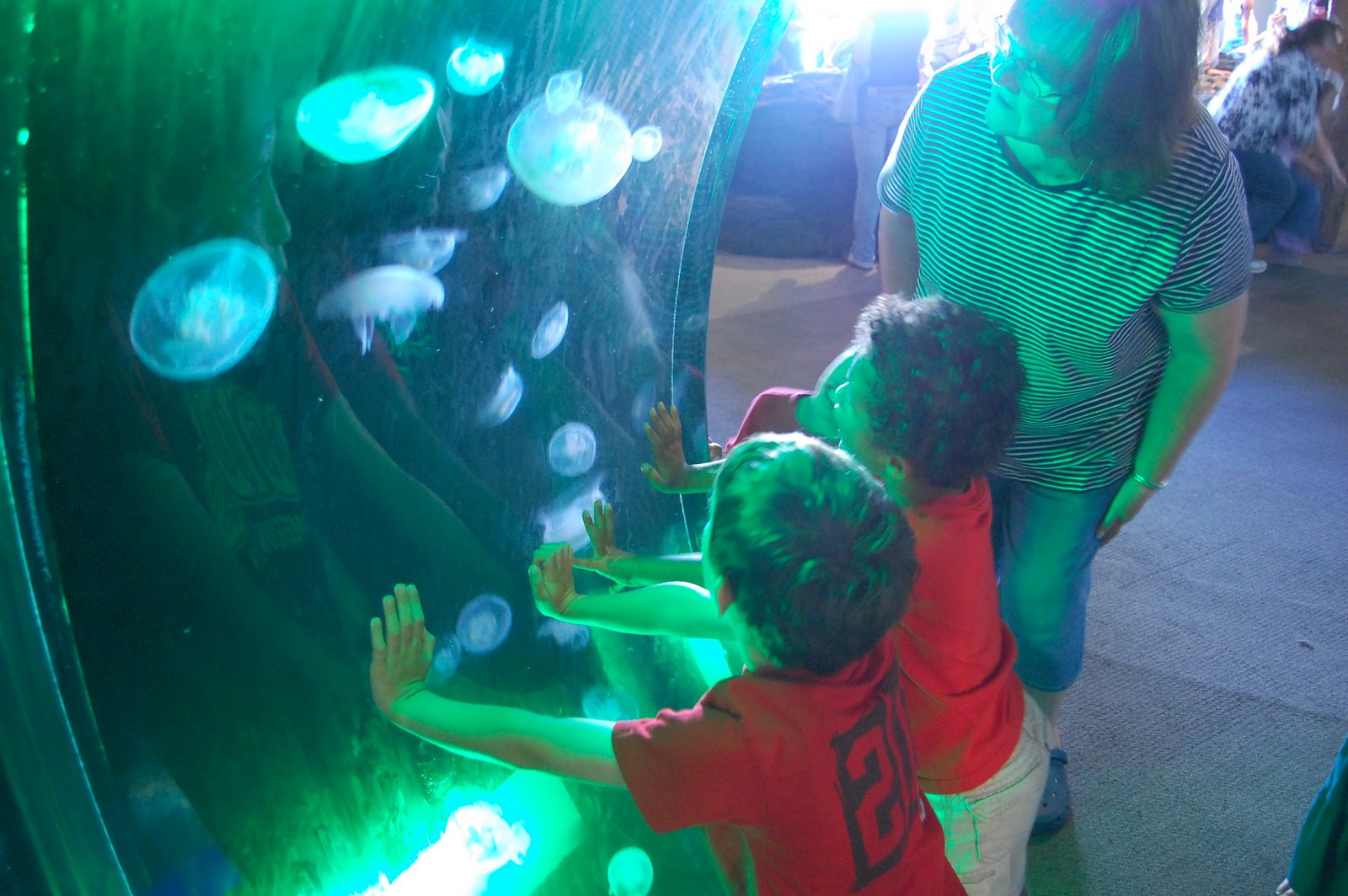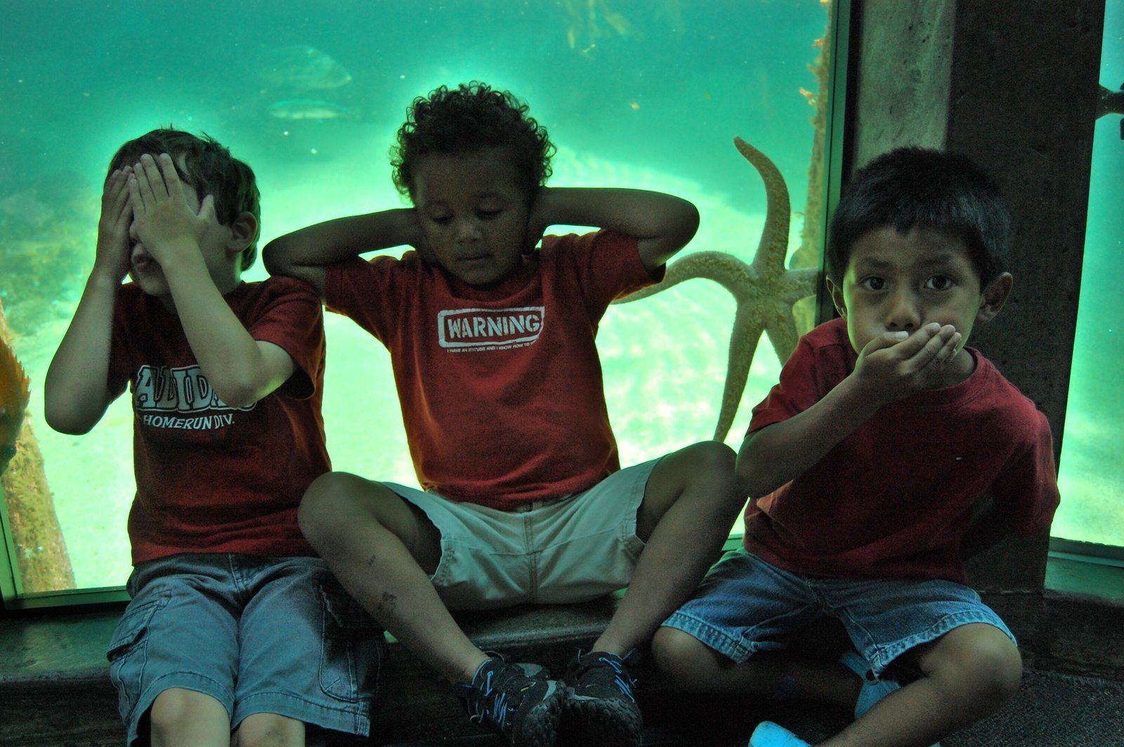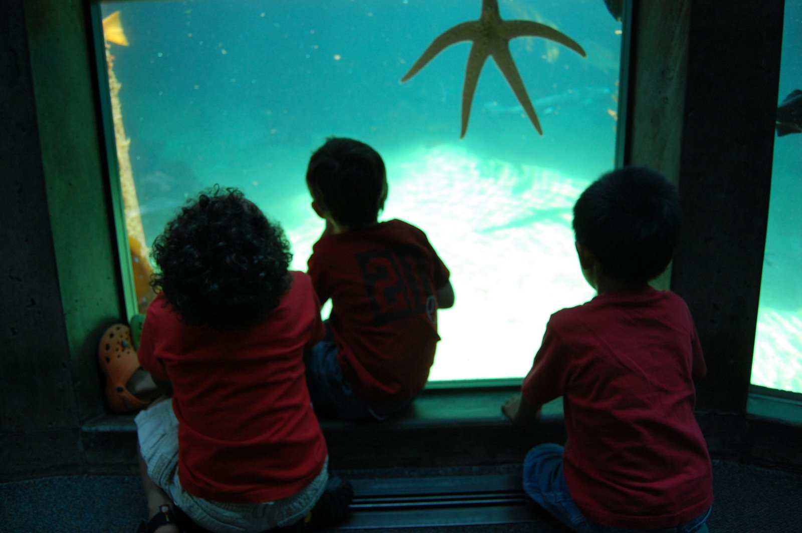 Nana and I took the boys into the big city for a trip to the aquarium. They love going on the ferry and the walk to the aquarium is fairly short and we’re members so it’s an ideal place to go. Not to mention that the boys LOVE it. Levi could spend his whole trip at the touch tank. We got to see the feedings at the dome area, which was cool, but we had to wait quite a bit and snapped a “See No Evil, Hear No Evil, Speak No Evil” shot of the guys while we waited. We brought along the stroller to haul stuff (and Trey if he got tired) and Carlos decided he’d spend most the trip riding in it. He also went to bed tonight at 7:30 so I’m guessing he’s not feeling 100% great.