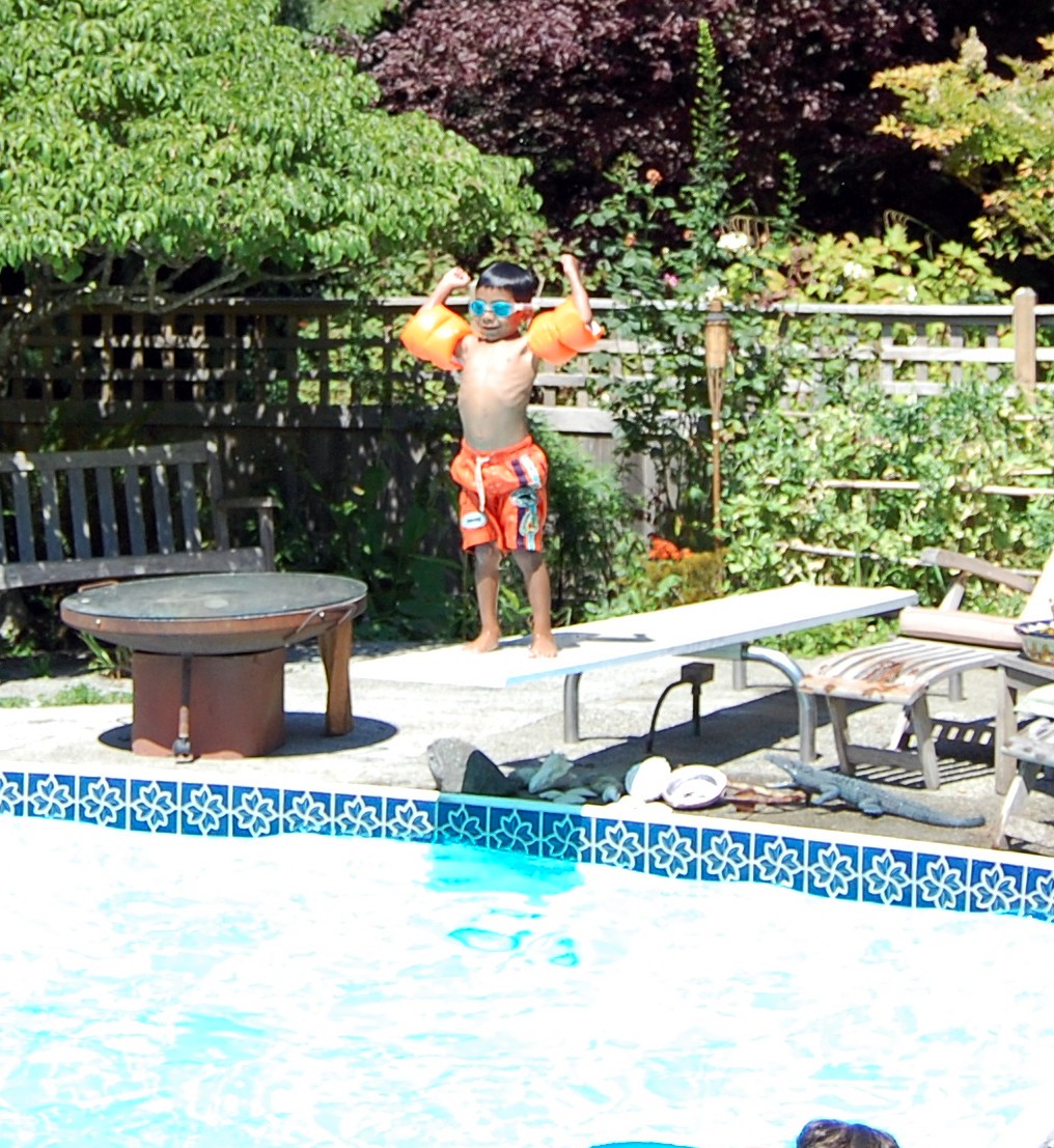 Yesterday we got quite the treat, with the weather being 95+ degrees here in Seattle it was more than refreshing to be able to spend the afternoon at our friend Helen’s pool. Her backyard is absolutely incredible, she has an amazing green thumb and her plants are thriving. Add to that, the pool. The kids are all at the stage where they can at least dog paddle to the side and Carlos found that arm floaties were the way to go. He and Trey used them and got around everywhere. Levi and Alice were busy doing flips and cannonballs off the diving board. Carlos even learned how to do a somersault in the shallow end. Pretty cool. Thanks to Nana for helping up out and many thanks to Helen for letting us swim. Hoping to repeat the trip in the future.