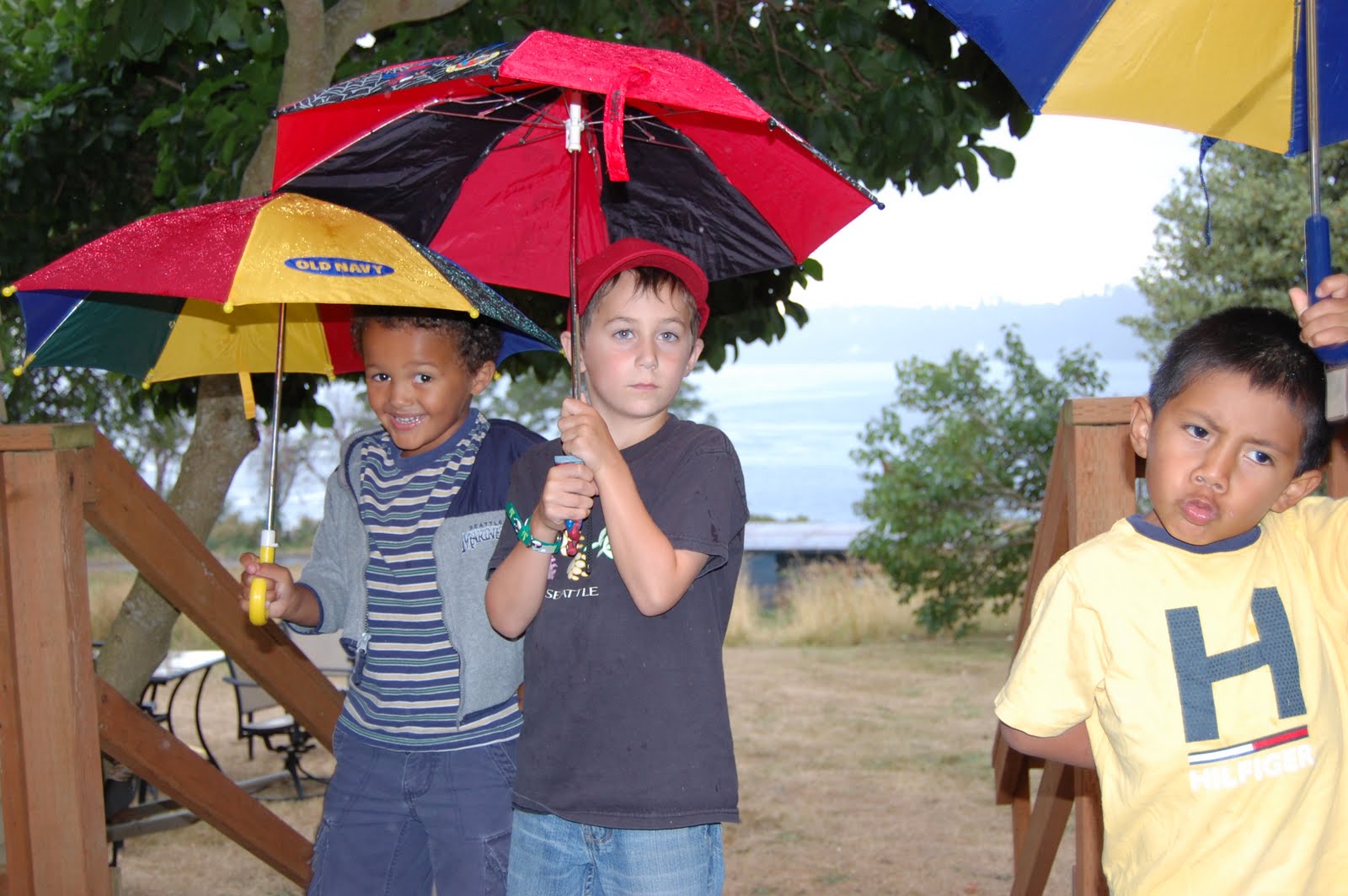 We’ve had the heat this summer (record breaking 100+ degree days) and last week we cooled off and actually had a little rain. The boys all have umbrellas hanging up with their coats and couldn’t wait to use them so the minute the drops started to fall they were out on the deck with their bumbershoots in hand. Happy, happy Northwest boys!