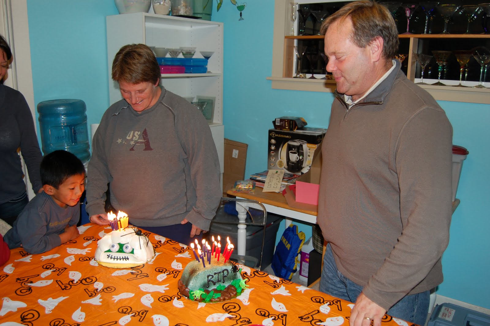 Dee’s birthday is officially tomorrow but we have a standing Monday night “family dinner” with Mary and Alice and now our friends, Rick and Michelle. Since Rick and Dee share a birthday, we had a special early birthday celebration. I found some cool Halloween cakes and the kids really got into singing. I was telling Trey and Carlos’ teachers that tomorrow is Dee’s b-day and Kathy said that Trey had told her that we already celebrated, but she didn’t get any presents. Poor Dee! Presents come tomorrow!