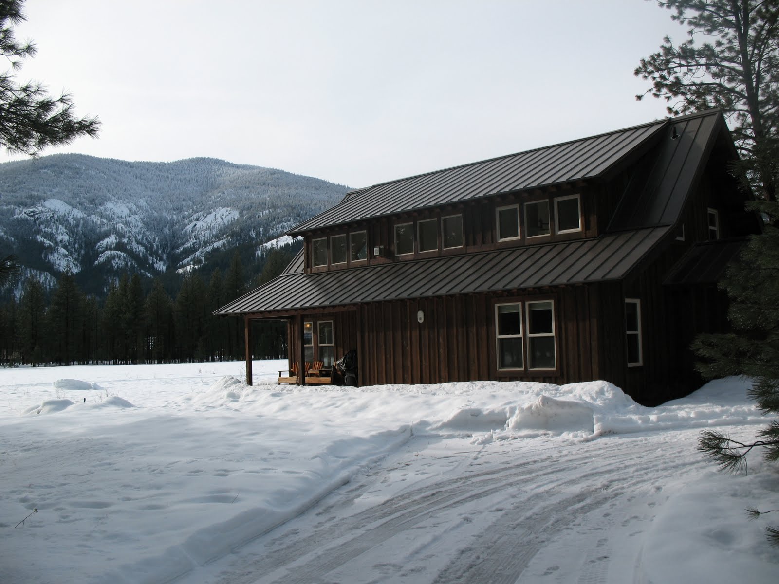 After the side trip to Leavenworth, we pushed through until we got to Winthrop and made a quick stop at the grocery store to stock up on the perishables for the weekend. Roads still bare and dry until we got to Mazama, then there was snow EVERYWHERE but only the little road to our house has compact snow. We got in safe and sound and the house is amazing.