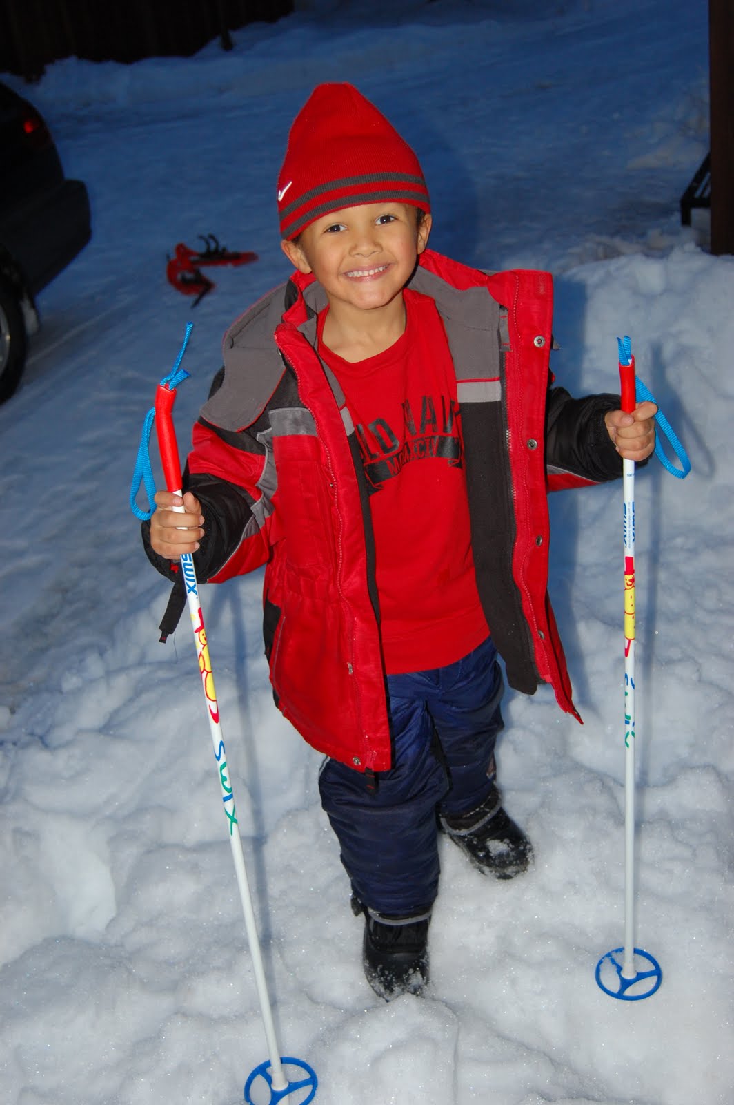 The kids couldn’t wait to try cross country skiing. There is a trail (or about 160 miles of them) right outside our house so we see people skiing by at all times of the day. We didn’t take them on the trails, but just down the snow covered road in the neighborhood. It worked and they loved it. There was even a small hill at one point so they got to go “fast”. Of course, our thrill seeker Carlos thought that was cool. He then proceeded to jump up with his skis and try tricks. Trey was happy doing the snow shoes and kept jumping up from the road and onto the snow bank and back down again. Levi was really good at it once he got it and he liked it!