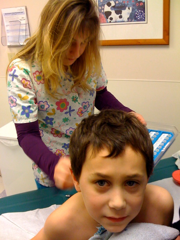 Next was the dreaded part of the exam, the allergy testing. We didn’t do the food allergies, since Levi has never had issues with any foods, but there were 40 of the most common allergens to test for. The nurse showed him the kit, then got started. It took Dee holding his hands still while the scratches were being done. Levi was as brave as can be expected, he even started laughing at one point to keep from crying. About half way through he had had enough and asked her to stop, but he was a champ and finished it off. Oh, it hurt and it was so hard to see him go through that.