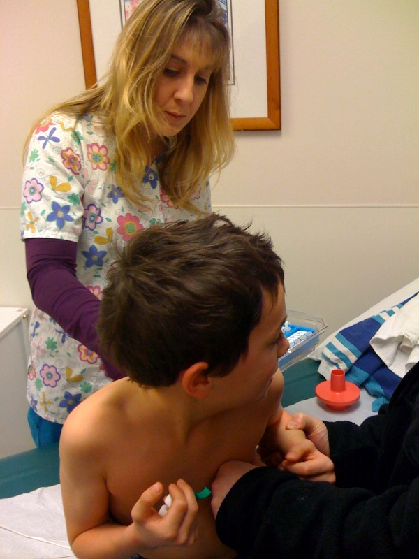 We tried to prepare Levi for the testing that was to come, it was going to be a 2-2 1/2 hour appt and not so fun with the allergy testing. The night before, I pulled Levi up to the computer and read him our friends Robb and Rebecca’s blog since their son, Noah, just went through the same testing. It was an honest look at just exactly was going to happen at the appt. The hardest part for Levi was seeing Noah crying during the scratch test, it made him tear up and get nervous. We reassured him that both Dee and I would be there with him and that he would be alright. It’s just what needed to be done to get him feeling better.