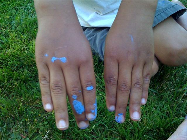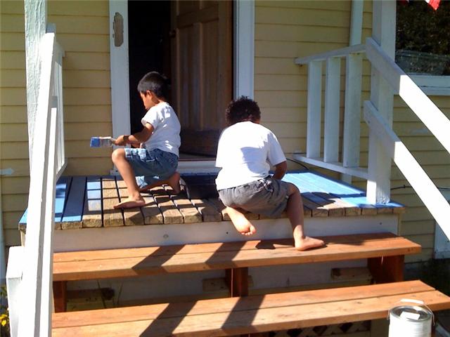We had a job to do, finally a warm summer day and some willing helpers. Child labor laws were strictly observed and only a little paint was spilled. I have to admit, I had a hard time painting over the cute little blue footsteps going down the stairs….