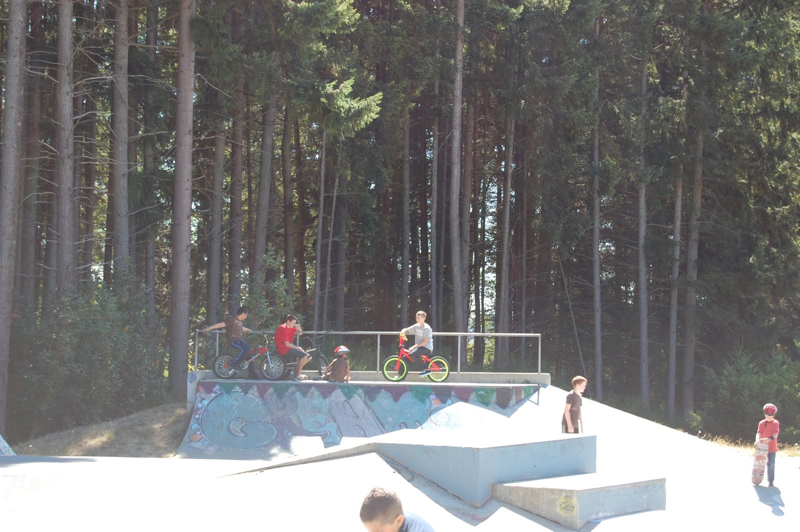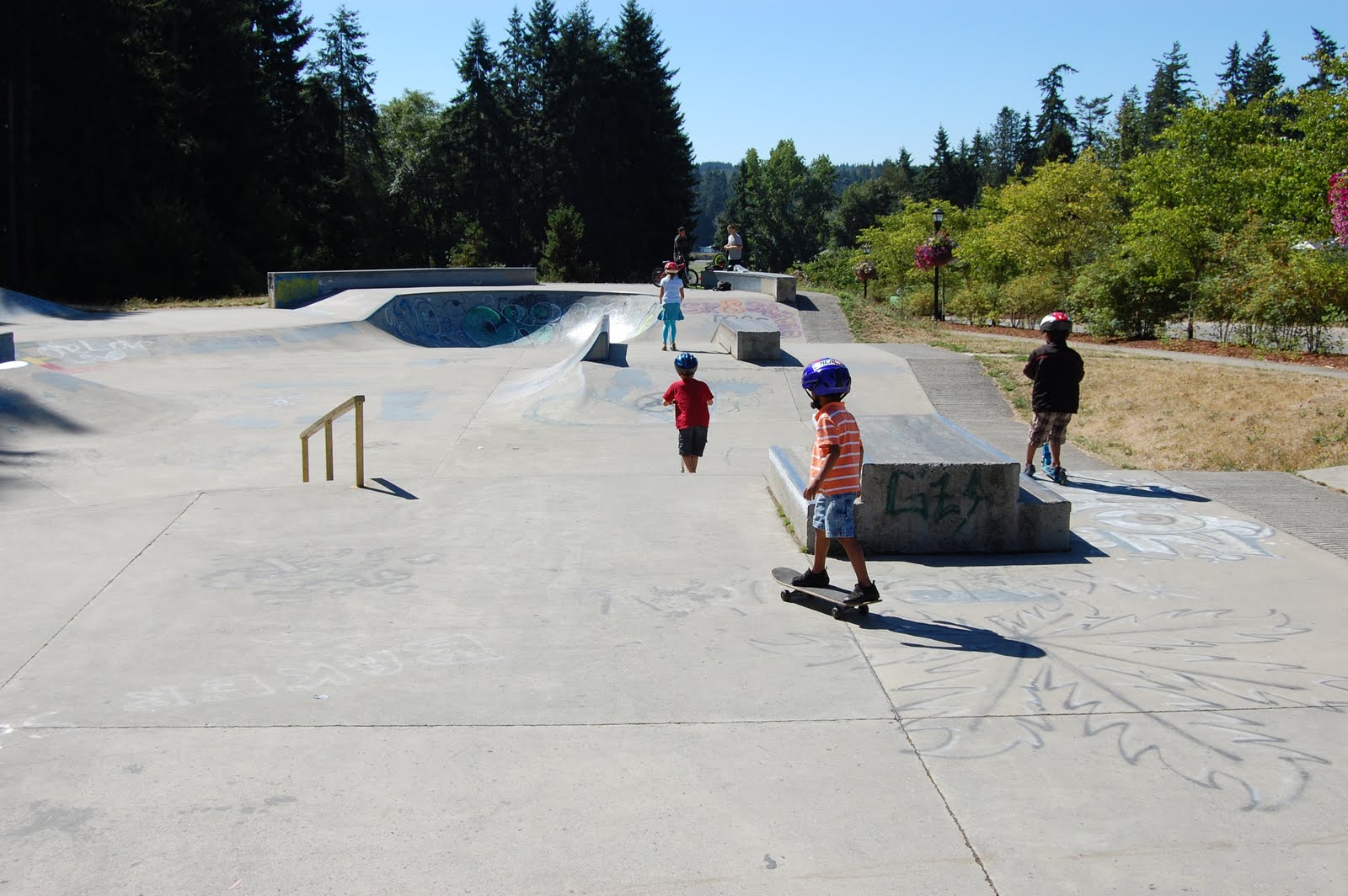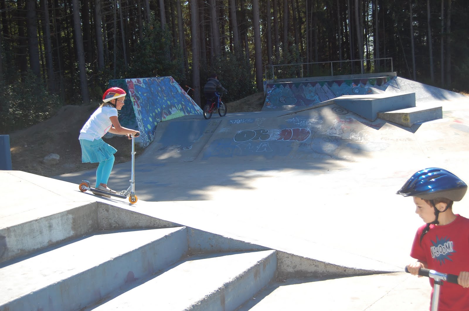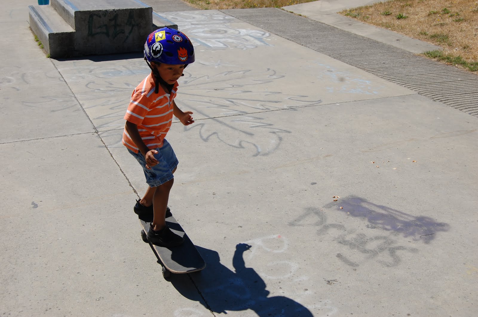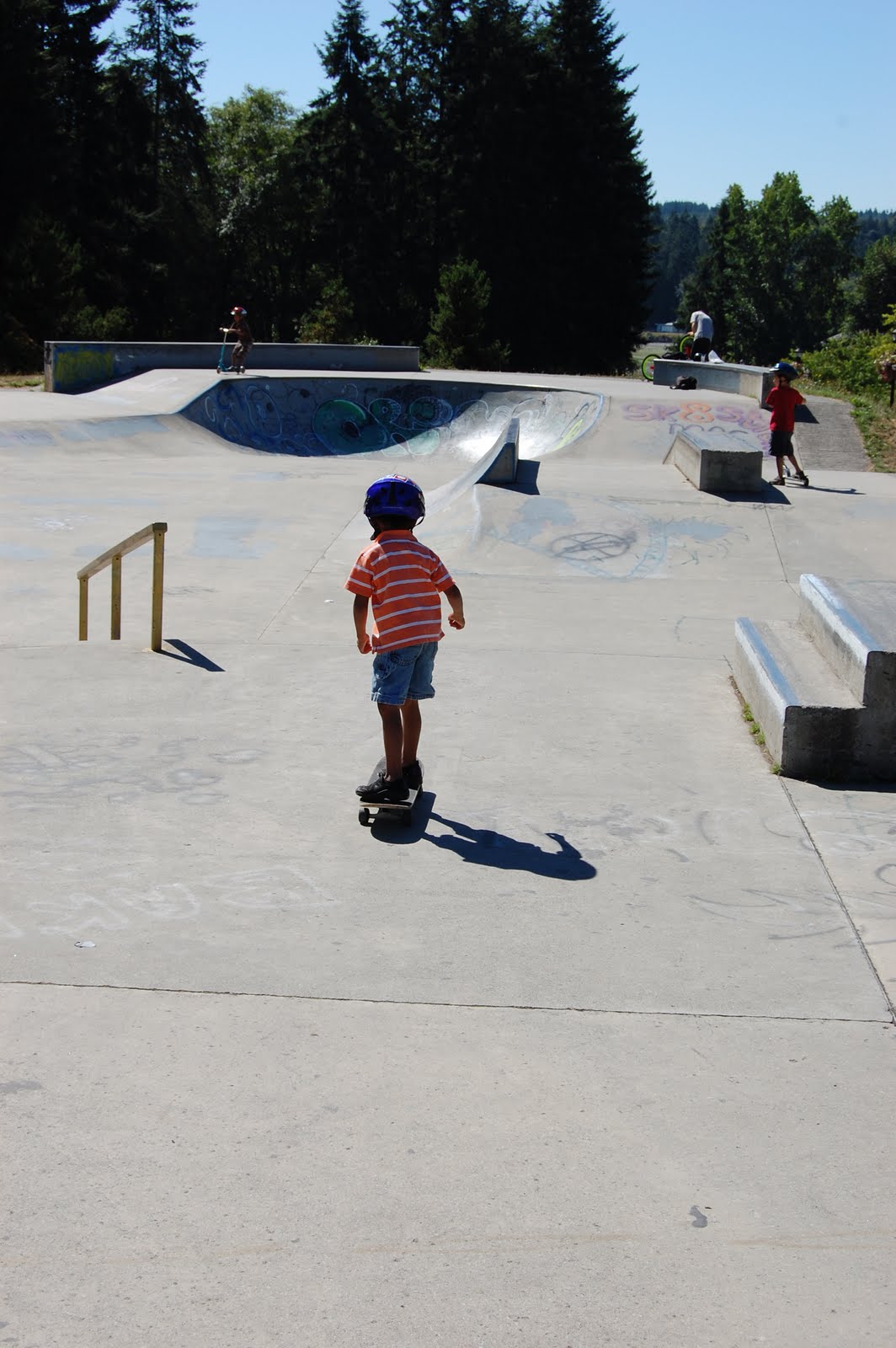 With 1 week left until school, Carlos and Alice were signed up for a skateboarding camp that ended up getting cancelled. So, today I decide that we’d do our own skateboard camp and I packed up Alice and the boys and headed toward Kingston. It was a perfect park for our crew, Alice, Levi and Trey all rode Razor scooters and Carlos worked on his skateboarding. There were lots of kids there, and we even ran into our friend Jessie and had a chance to catch up with her. Trey is always so funny when there are big kids around, he tries to be super cool and chat them up. Got one picture of him entertaining them.