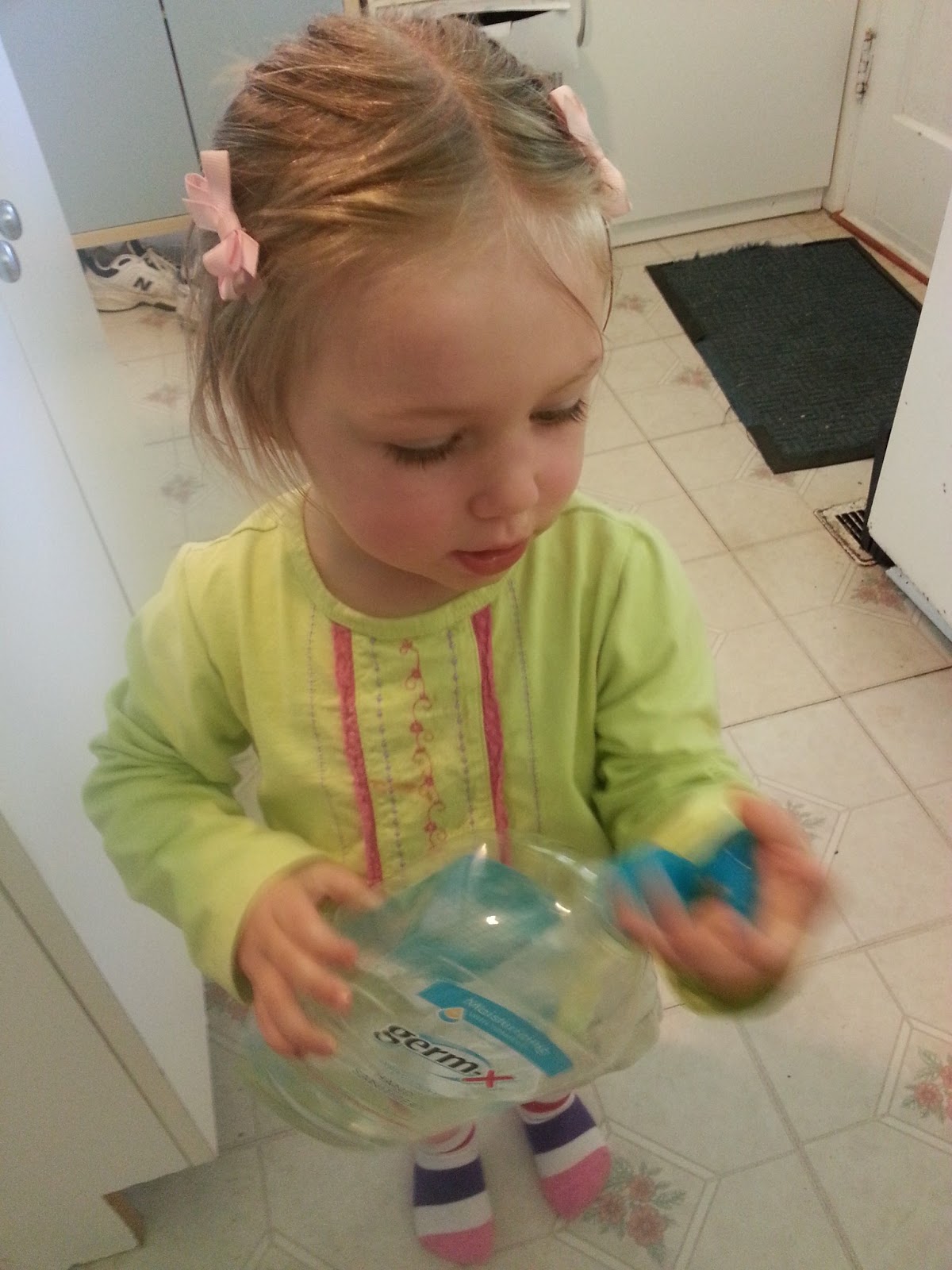 There are different cloths for different jobs and a mitt that is just like a huge Mr Clean Magic Eraser without the chemicals and completely washable. Dee and I are actually having fun finding marks to wipe away (we have done the walls, pen marks, the microfiber couch, spots on the carpet…gone!).