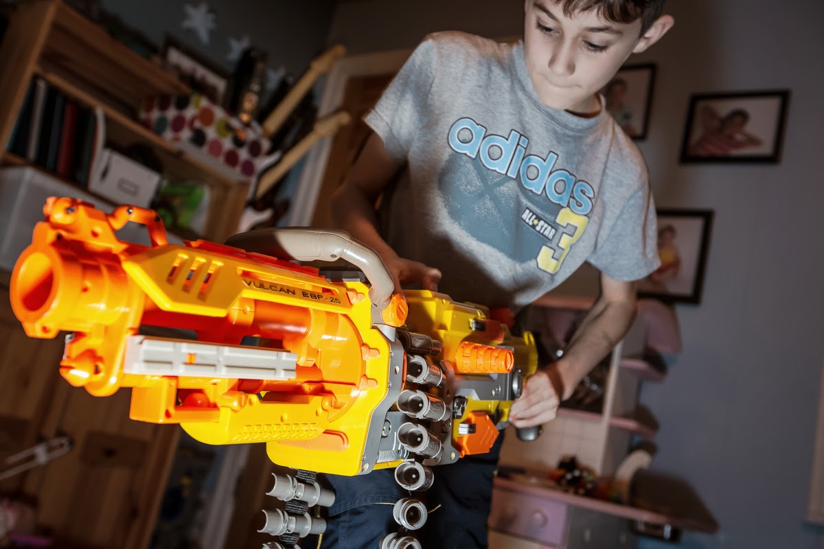 The boys had the chance to be a part of an ongoing photography project by the great Cameron Karsten again! This one about American Gun Culture. The pictures came out amazing, as always, and the boys had a blast having a massive Nerf War in the living room.