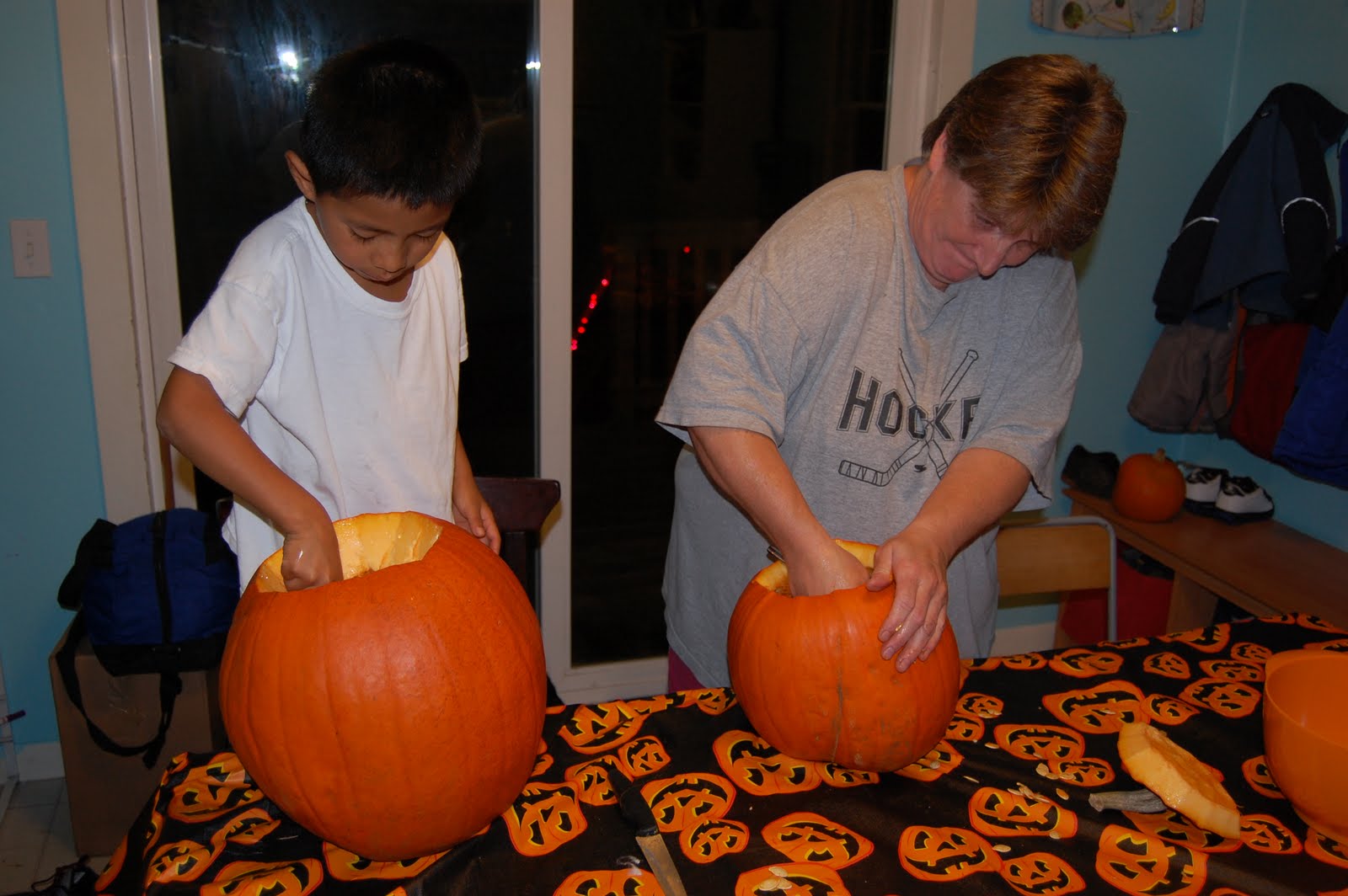 Our pumpkin carving was a success! Carlos wanted me to carve the pirate ship and I did the Pumpkin Masters pattern, poked the little holes and carved until my fingers cramped. Carlos carved Baby R’s pumpkin with the face he thought he’d want it to have (super cute) and Dee FREEHAND carved both Trey’s flaming face pumpkin and Levi’s scarecrow pumpkin. She’s talented!