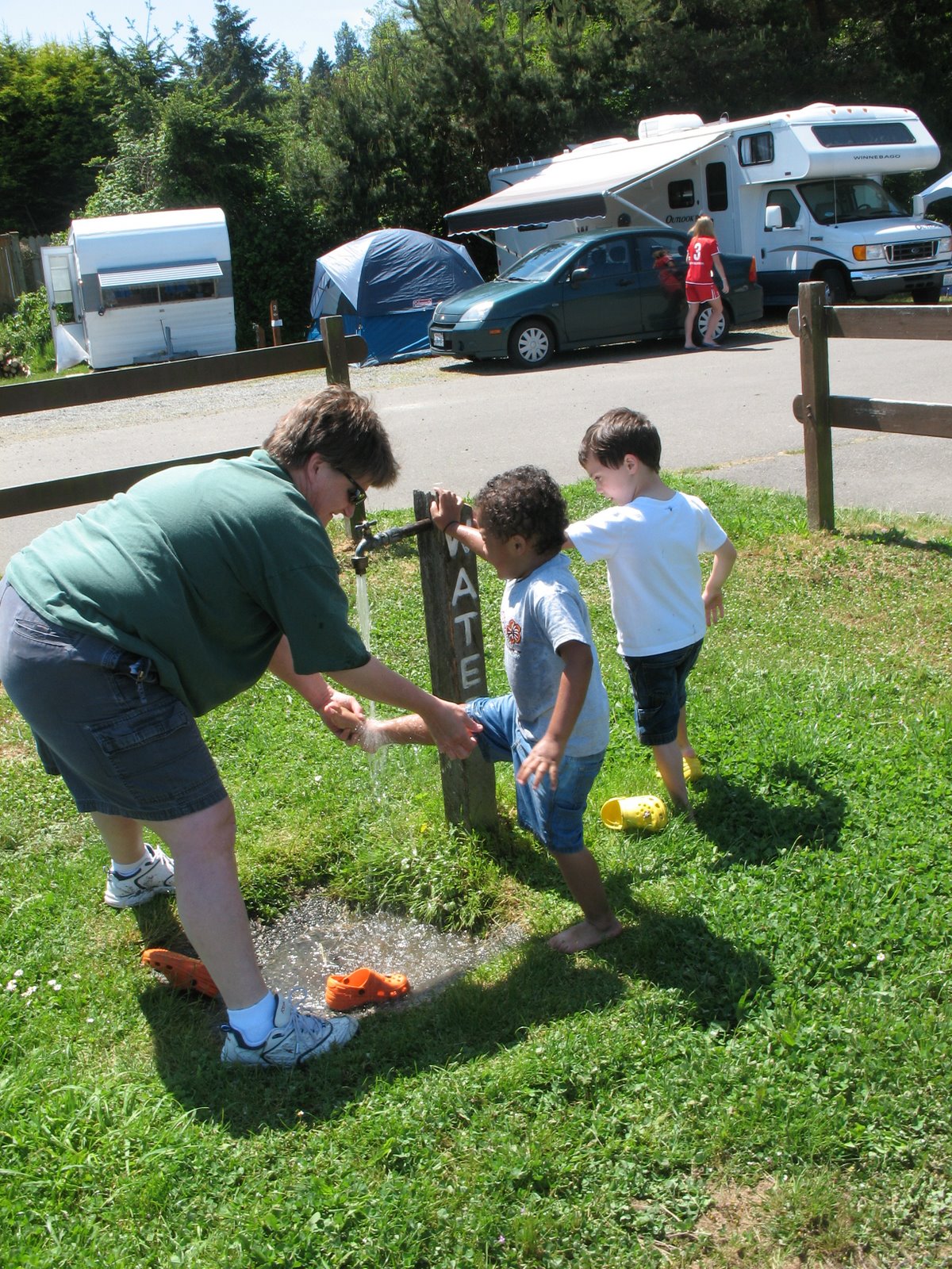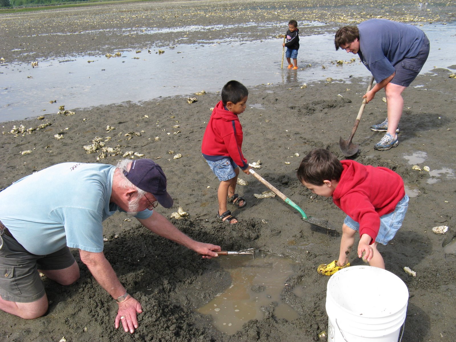 All of our efforts may have been in vain…we’ll find out tomorrow morning if we have to pitch our clams and oysters that we dug/schucked today at Quilcene. There was nothing on the hotline but online it says there may be a biohazard (aka red tide) and that would really bite. We worked hard to get our limits. Either way , it was a fun family outing. The boys kept busy picking out clams and stomping in the water. Then they chased baby crabs around and stacked up oysters in an old tire. When we were done we were all smelly, muddy and happy.