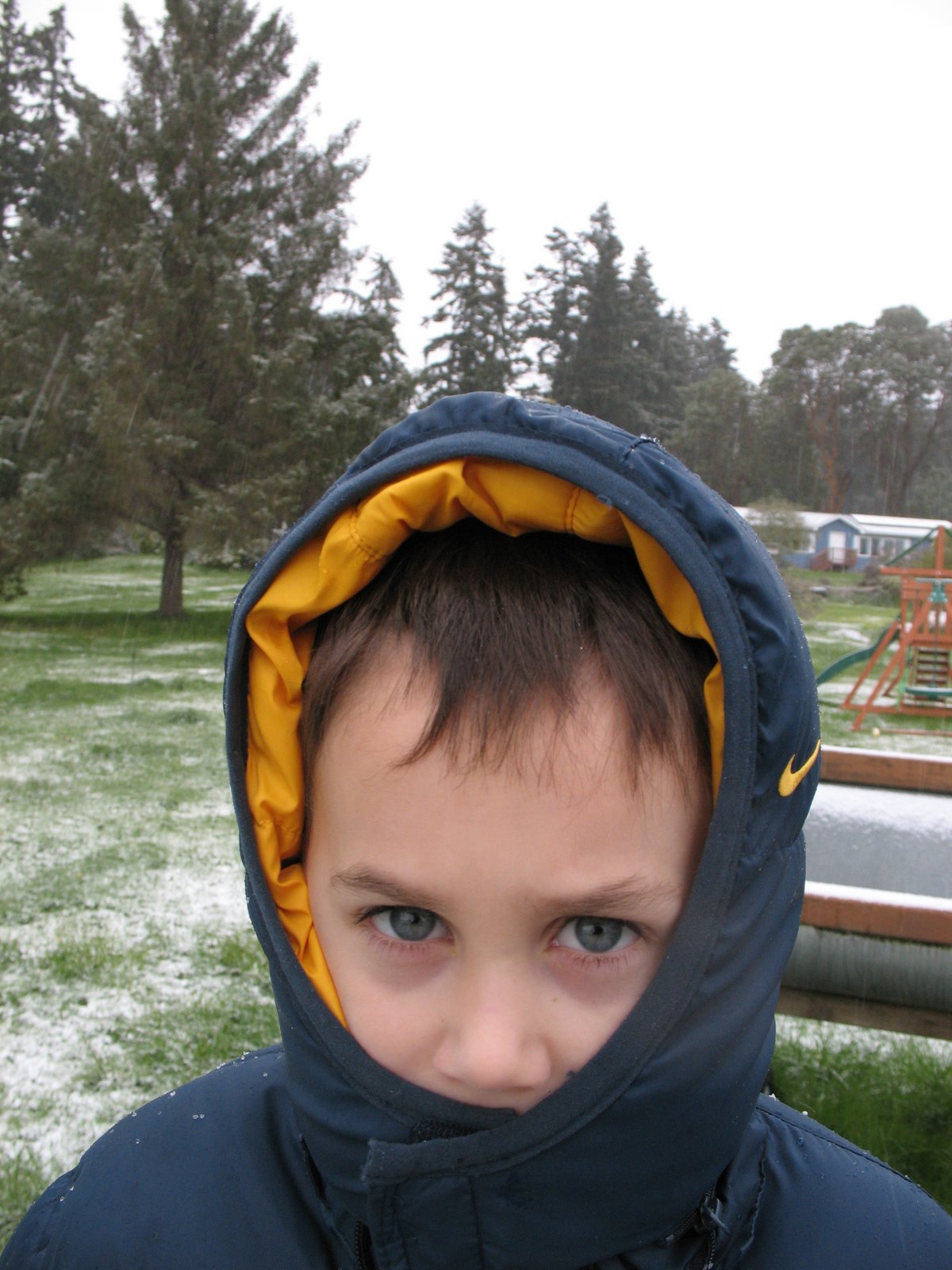 Started the day out lazy, Dee finished up her book and Trey played with Baby X. I ran to the store with Carlos and Levi slept in. When Carlos and I got home it started to hail, a LOT and for about 10 minutes. Then it turned to snow, for almost an hour. It was wet, and not a ton of it but the boys had fun playing outside and catching it on their tongues. Came in and warmed up in a steaming bath. Like Carlos’ new necklace? Twenty five cents at Safeway and he won’t take it off.