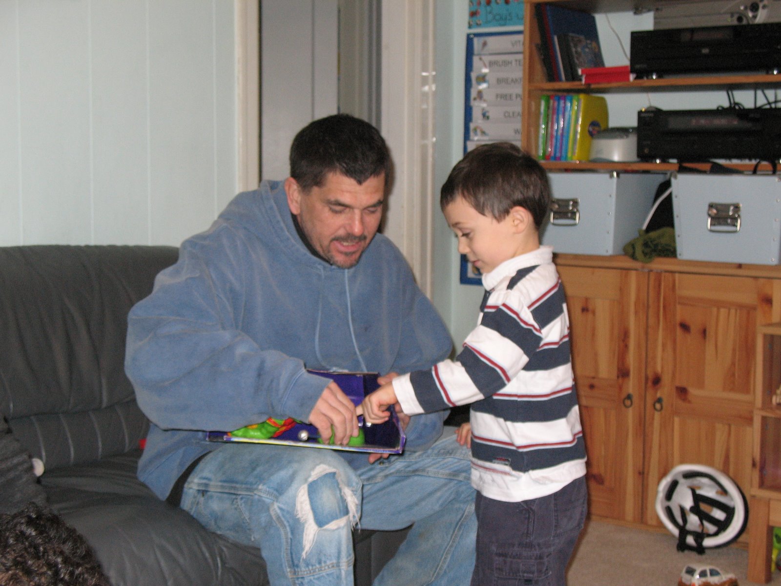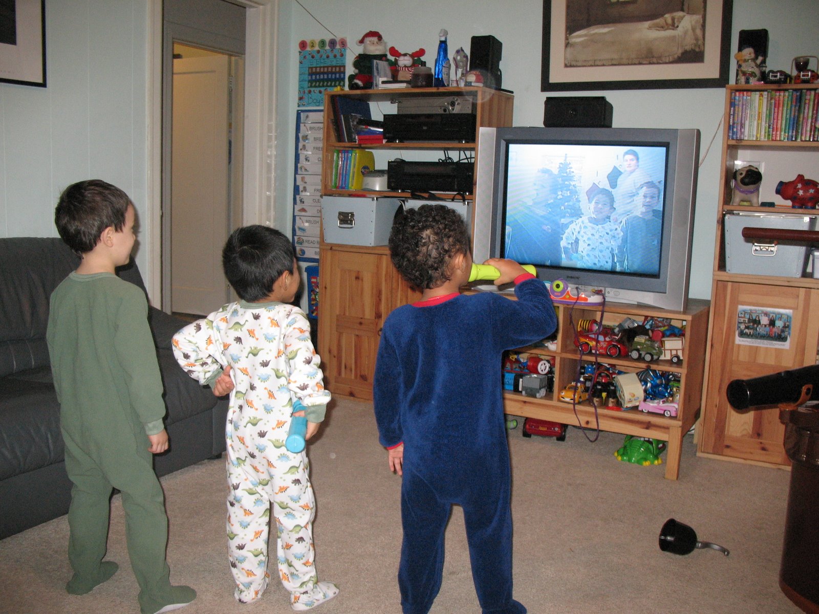 Anyhow, we had a great time at Gramma Patti and Gramma Jeanie’s house yesterday, they got the boys a karaoke machine that has a camera that hooks to the tv so you can see yourself singing. Dee’s off to the store right now to get some batteries but we hooked it up and they LOVED seeing themselves on the tv. Many silly faces were made, our boys are total hams. The next American Idol is standing in our living room.