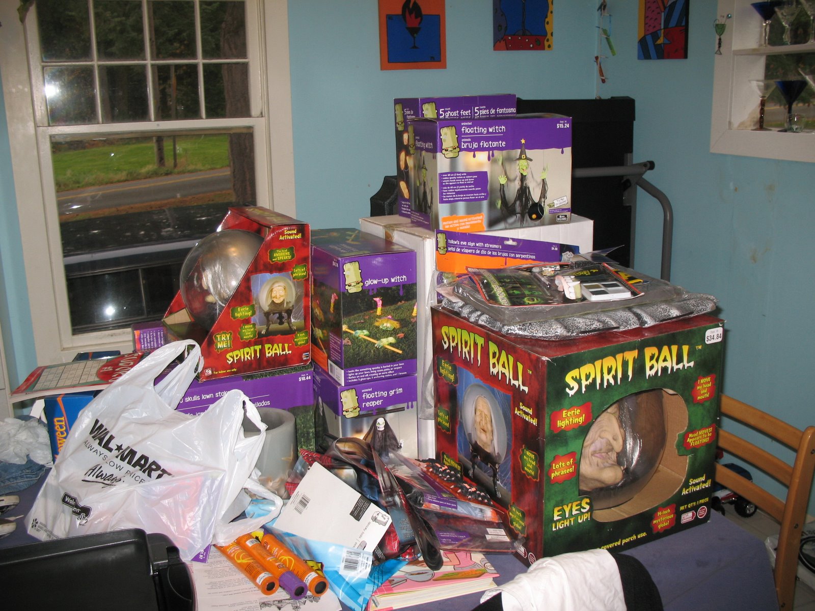 So I went to the Evil Empire today to do some after Halloween shopping, the picture does NOT do it all justice. Who knew that I was going to hit the motherload?!?!? Seriously, I saved 86% today and got a TON of stuff. Spent $44.40 and filled the kitchen table with decorations. Lots for outside, some for inside. Most animated or light up and a couple of costumes. A full size grim reaper, a huge talking face in a ball, most was $2 each or 4 for $1. Carlos got 3 new pairs of underwear for 25 cents. He doesn’t care if they are Halloween, they have bats on them and they glow in the dark, what boy wouldn’t love that?! So all of this stuff, two cartfuls, was going to be for Dee for Christmas but I couldn’t wait and gave it to her right when I got home. What can I say, I love her.