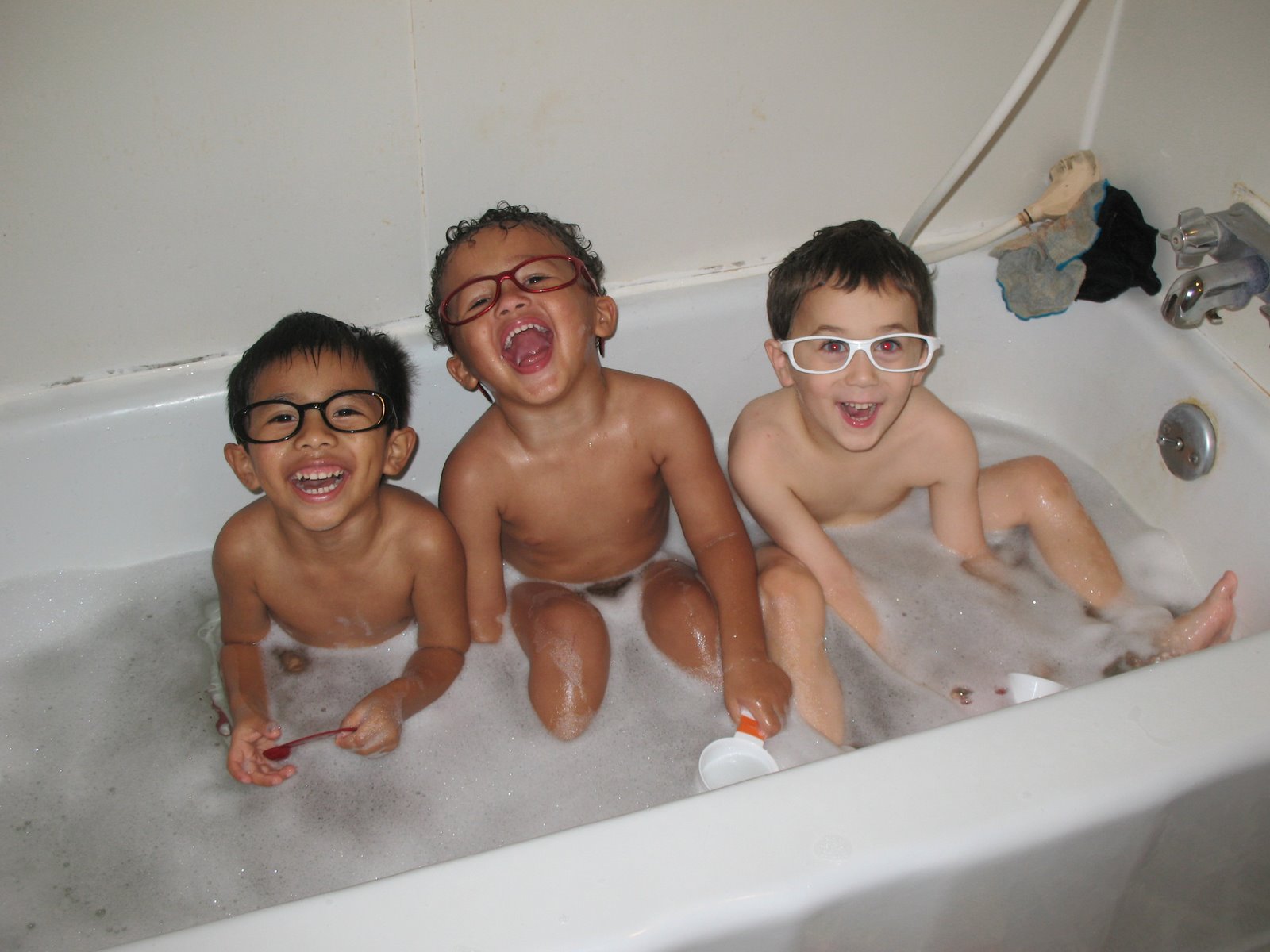 The other pictures are from last night when we got the boys some new glasses at Target (on clearance for 25 cents each and we just pop the lenses out). They have been wearing them a lot. Super geeks, yes they are, but a quarter well spent. Dee also had fun watching them in the tub and catching up on reading the latest “Us” magazine.